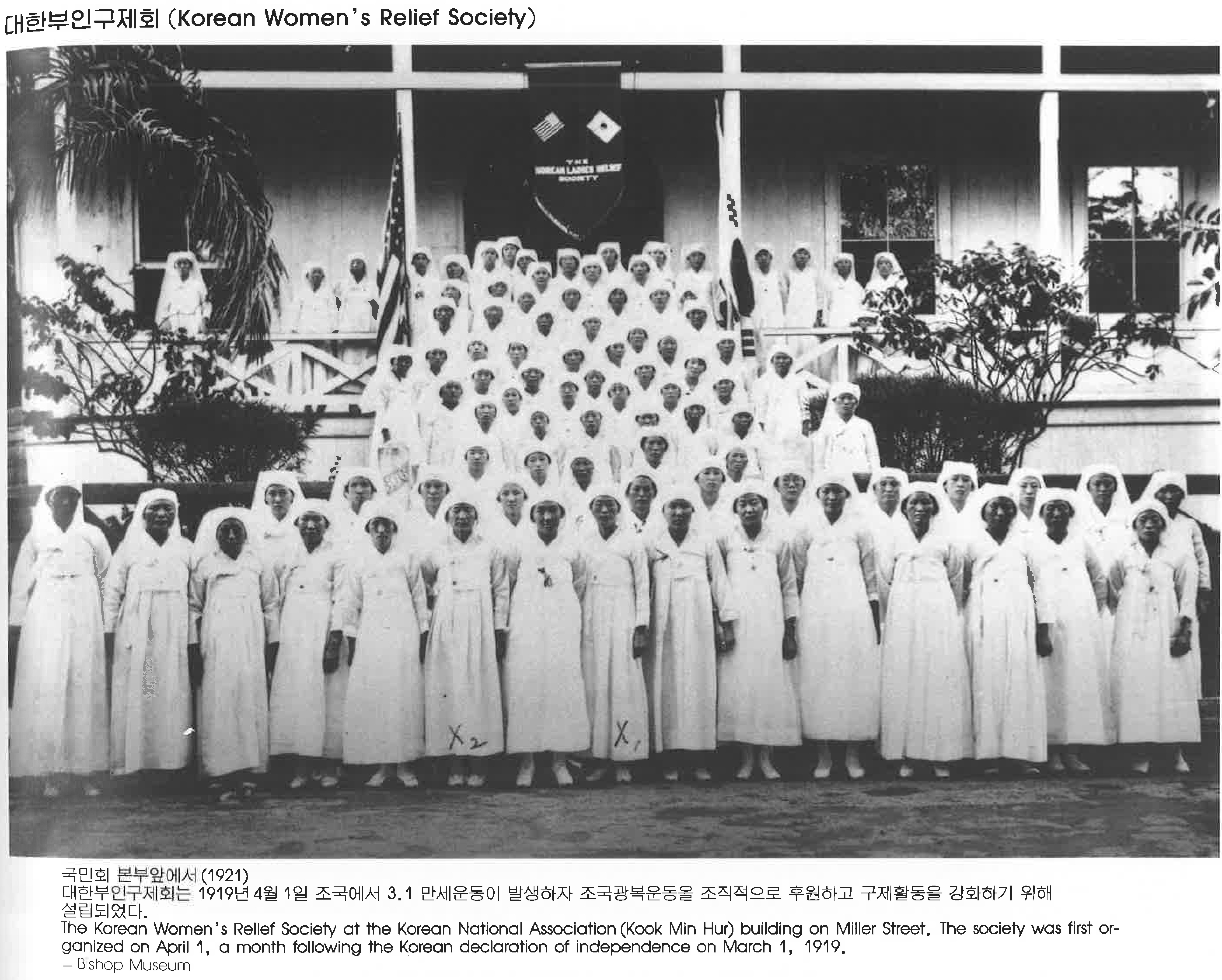 국민회 본부앞에서 (1921) 대한부인구제회는 1919년 4월 1일 조국에서 3.1 만세운동이 발생하자 조국광복운동을 조직적으로 후원하고 구제활동을 강화하기 위해 설립되었다. The Korean Women’s Relief Society at the Korean National Association (Kook Min Hur) building on Miller Street. The society was first or ganized on April 1, a month following the Korean declaration of independence on March 1, 1919.