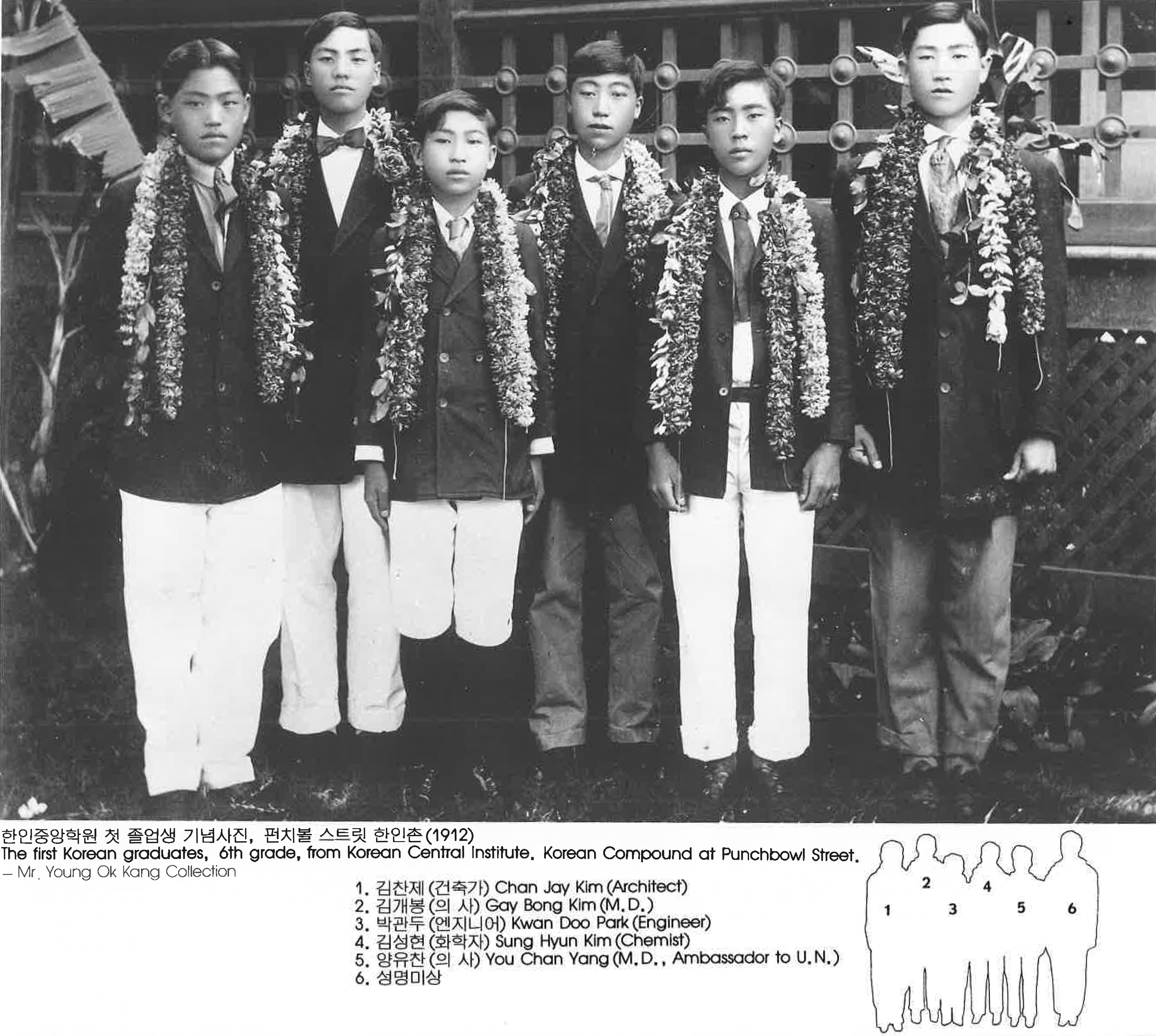 한인중앙학원 첫 졸업생 기념사진, 펀치볼 스트릿 한인존 (1912: The first Korean graduates, 6th grade, from Korean Central Institute. Korean Compound at Punchbowl street 一 Mr. Young Ok Kang Collection 1. 김잔제 (건축가) Chan Jay Kim (Architect) 2. 김개봉 (의 사) Gay Bong Klm(M.D.) 3. 박관두 (엔지니어) Kwan Doo Park (Engineer) 4. 김성현 (화학자) Sung Hyun Kim (Chemist) 5. 양유찬(의 사) You Chan Yang(M.D., Ambassador to U.N.) 6. 성명미상