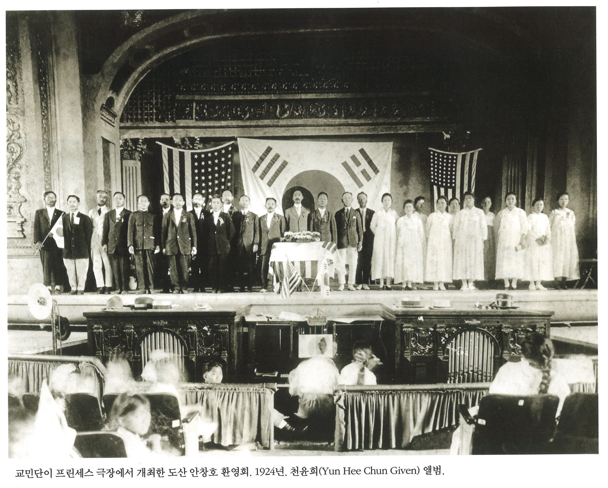 교민단이 프린세스 극장에서 개최한 도산 안창호 환영회. 1924년. 천윤희(Yin Hee Chun Given) 앨범.