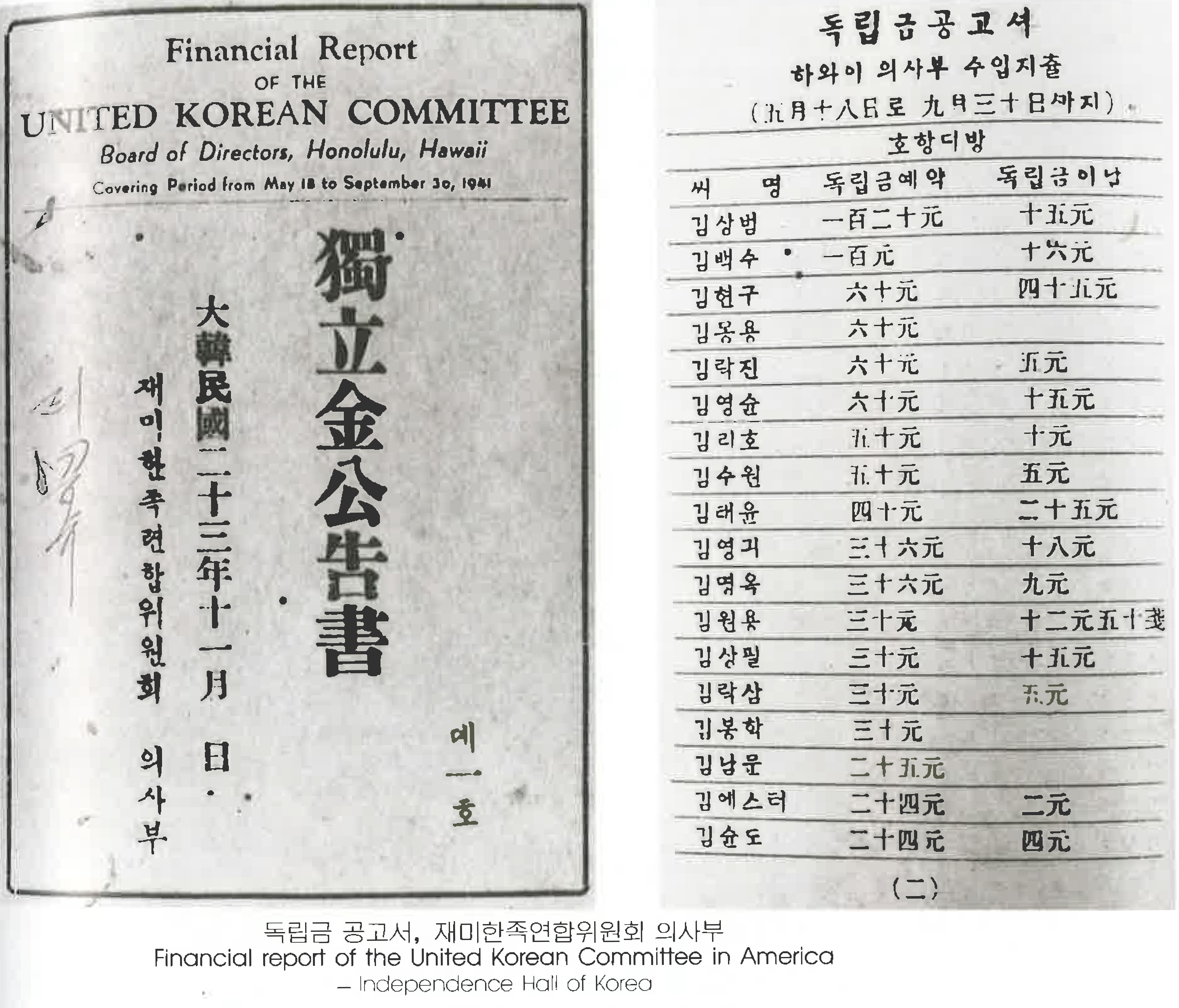 독립금 공고서, 재미한족연합위원회 의사부 Financial report of the United Korean Committee in America