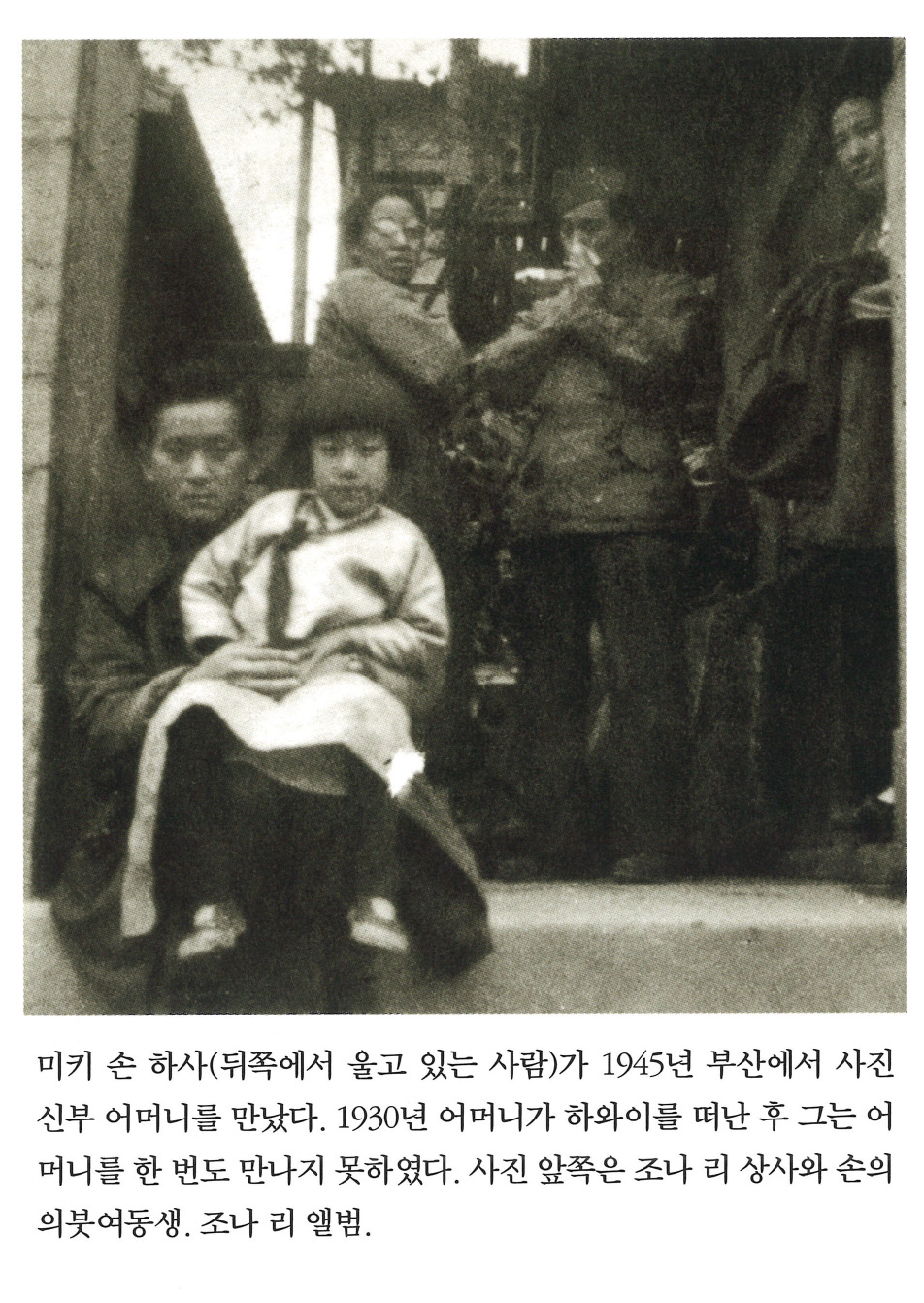 미키 손 하사(뒤쪽에서 울고 있는 사람)가 1945년 부산에서 사진 신부 어머니를 만났다. 1930년 어머니가 하와이를 떠난 후 그는 어머니를 한 번도 만나지 못하였다. 사진 앞쪽은 조나 리 상사와 손의 의붓여동생. 조나 리 앨범.