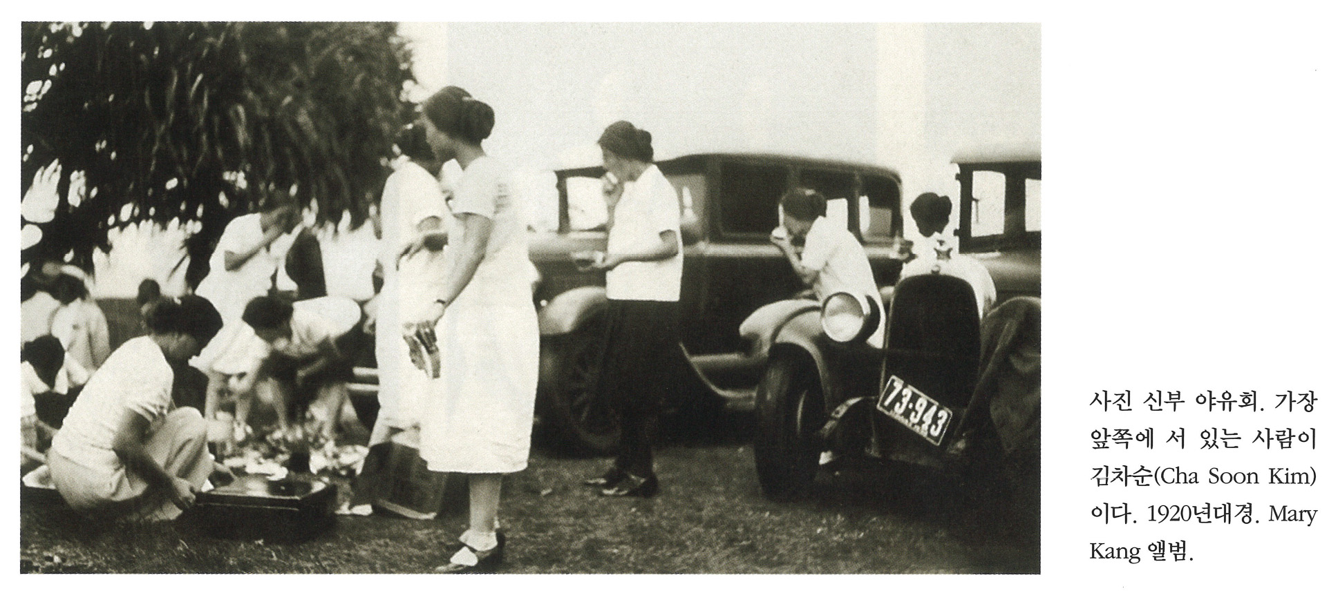 사진 신부 야유회. 가장 앞쪽에 서 있는 사람이 김차순(Cha Soon Kim)이다. 1920년대경. Mary Kang 앨범.