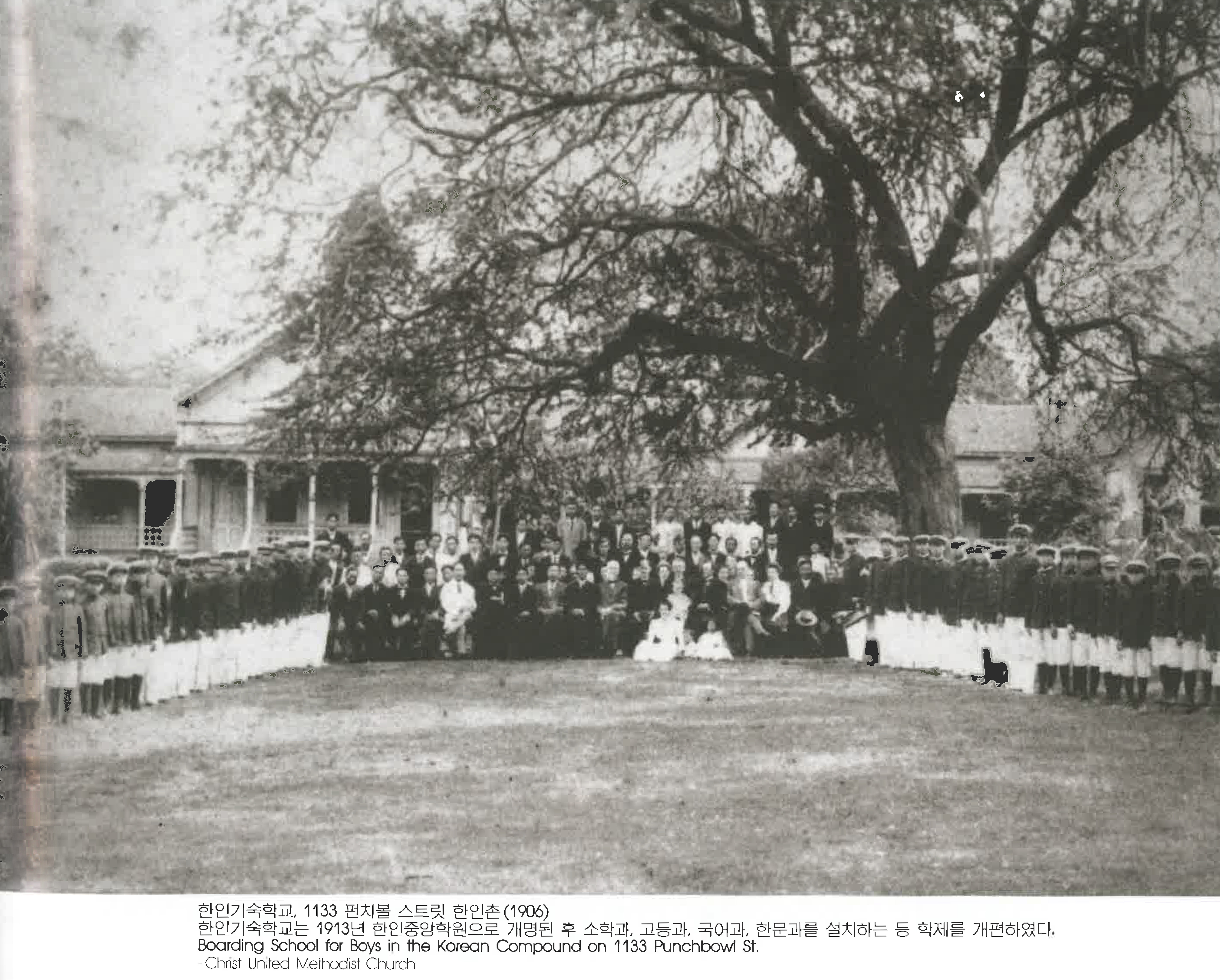 한인기숙학교,1133 펀치볼 스트릿 한인촌(1906) 한인기숙학교는 1913년 한인중앙학원으로 개명된 후 소학과,고등과, 국어과, 한문과를 설치하는 등 학제를 개편하였다. Boarding School for Boys in the Korean Compound on 1133 Punchbowl St. -Christ United Methodist Church