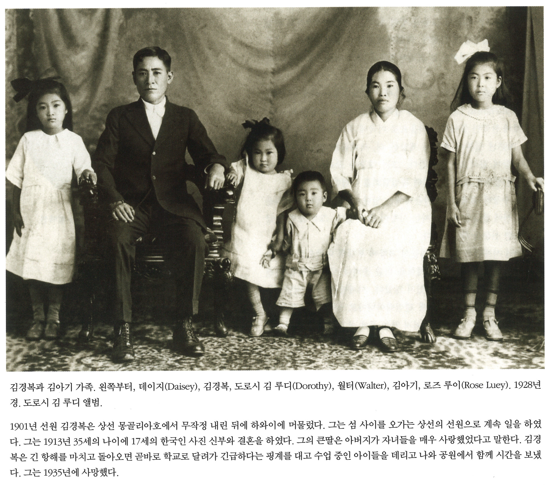 김경복과 김아기 가족. 왼쪽부터 데이지(Daisey), 김경복, 도로시 김 루디(Dorothy), 월터(Walter), 김아기, 로즈 루이(Rose Luey). 1928년 경. 도로시 김 루디 앨범.