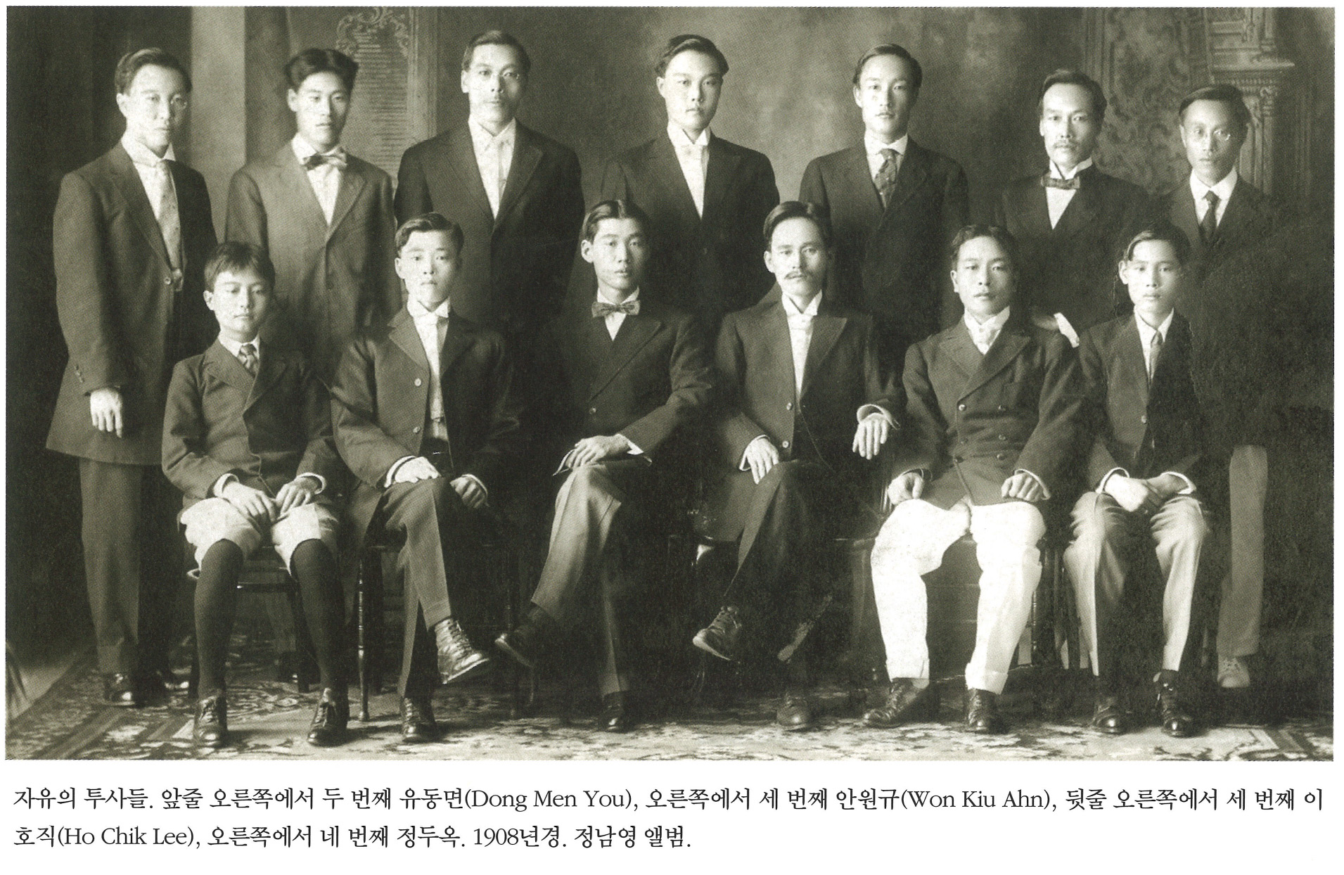 자유의 투사들. 앞쪽 오른쪽에서 두 번째 유동면(Dong Men You), 오른쪽에서 세 번째 안원규(Won Kiu Ahn), 뒷줄 오른쪽에서 세 번째 이호직(Ho Chik Lee), 오른쪽에서 네 번째 정두옥. 1908년경. 정남영 앨범.