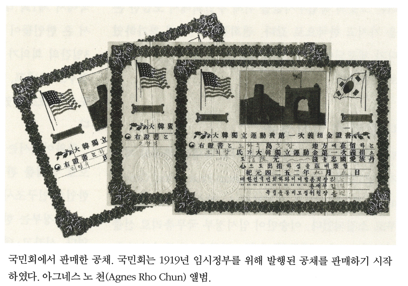 국민회에서 판매한 공채. 국민회는 1919년 임시정부를 위해 발행된 공채를 판매하기 시작하였다. 아그네스 노 천(Agnes Rho Chun) 앨범.