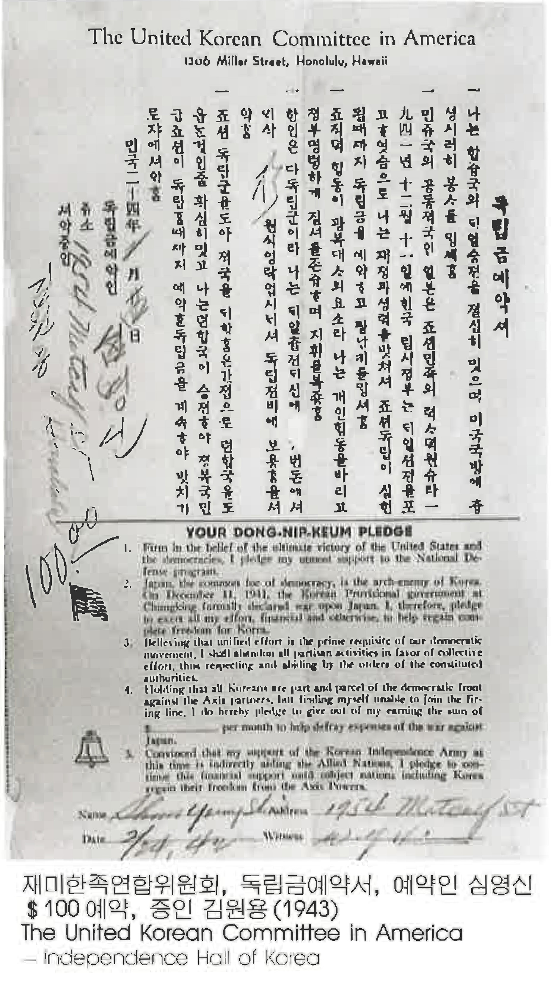 재미한족연합위 원회 , 독립금에약서,예약인 심영신 $100 예약, 증인 김원용 (1943) The United Korean Committee in America