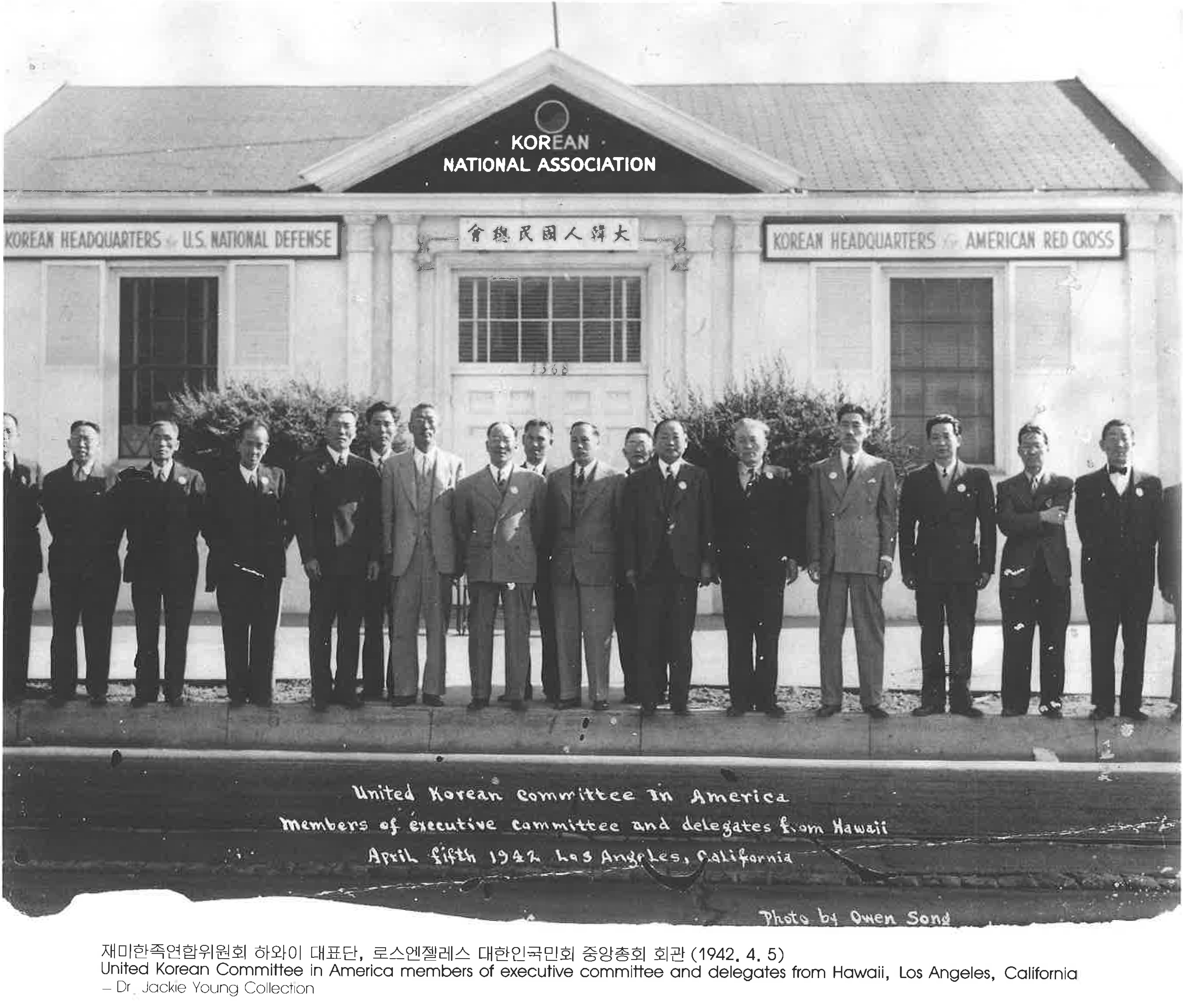 재미한족연합위 원회 하와이 대표단, 로스엔젤레스 대한인국민회 중앙총회 회관 (1942. 4. 5) United Korean Committee in America members of executive committee and delegates from Hawaii, Los Angeles, California