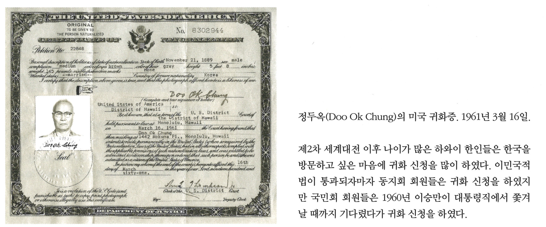 9xNaB3xe... | 정두옥(Doo Ok Chung)의 미국 귀화증. 1961년 3월 16일. 제2차 세계대전 이후 나이가 많은 하와이 한인들은 한국을 방문하고 싶은 마음에 귀화 신청을 많이 하였다. 이민국적법이 통과되자마자 동지회 회원들은 귀화 신청을 하였지만 국민회 회원들은 1960년 이승만이 대통령직에서 쫓겨날 때까지 기다렸다가 귀화 신청을 하였다. | 정두옥 | - | img2 | 25-09-14 | 25-12-06 | |||||||||||||||