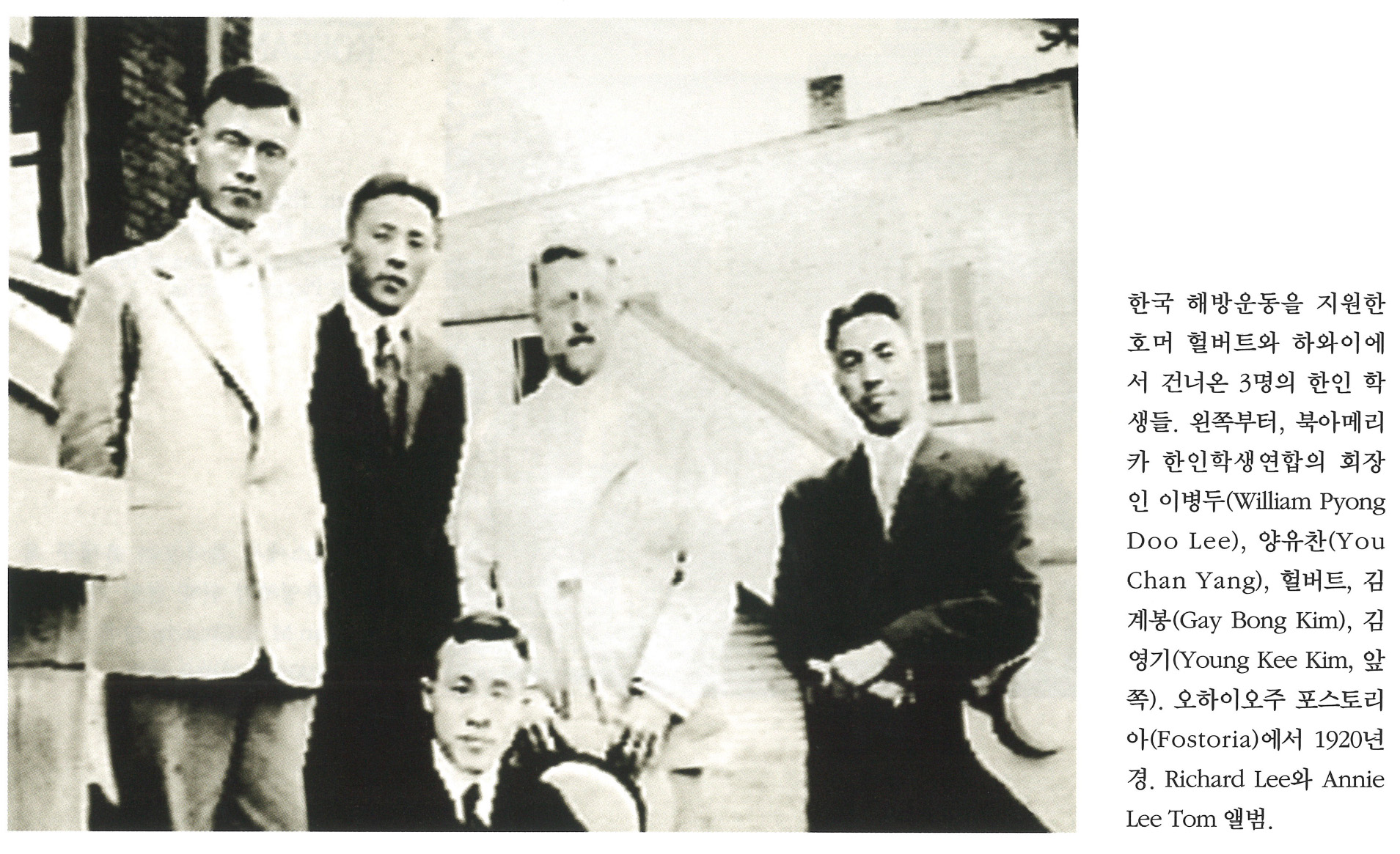 a.0lk-9s... | 한국 해방운동을 지원한 호머 헐버트와 하와이에서 건너온 3명의 한인 학생들. 왼쪽부터, 북아메리카 한인학생연합의 회장인 이병두(William Pyong Doo Lee), 양유찬(You Chan Yang), 헐버트, 김계봉(Gay Bong Kim), 김영기(Young Kee Kim, 앞쪽). 오하이오주 포스트리아(Fostoria)에서 1920년경. Richard Lee와 Annie Lee Tom 앨범. | 호머 헐버트, 이병두, 양유찬, 김계봉, 김영기. | - | img2 | 25-09-14 | 25-12-06 | |||||||||||||||