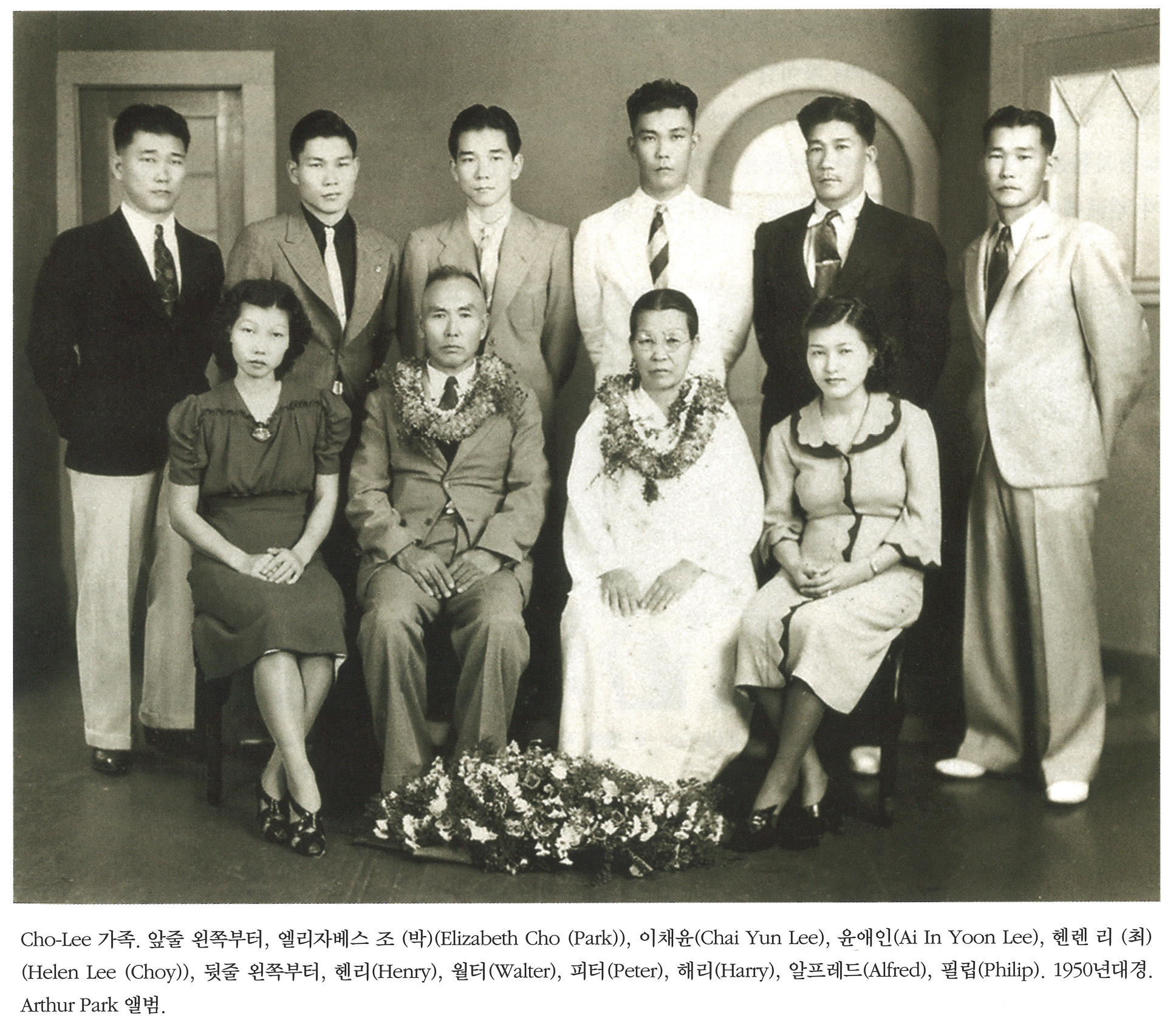 3PE9UERH... | Cho-Lee 가족. 앞줄 왼쪽부터, 엘리자베스 조 (박) (Elizabeth Cho (Park)), 이채윤(Chai Yun Lee), 윤애인(Ai In Yoon Lee), 헨렌 리(최)(Helen Lee (Choy)), 뒷줄 왼쪽부터, 헨리(Henry), 월터(Walter), 피터(Peter),해리(Harry), 알프레드(Alfred), 필립(Philip). 1950년대경. Arthur Park 앨범. | 엘리자베스 조 (박), 이채윤, 윤애인, 헨렌 리 (최), 헨리, 월터, 피터, 해리, 알프레드, 필립. | - | img2 | 25-09-14 | 25-12-06 | |||||||||||||||