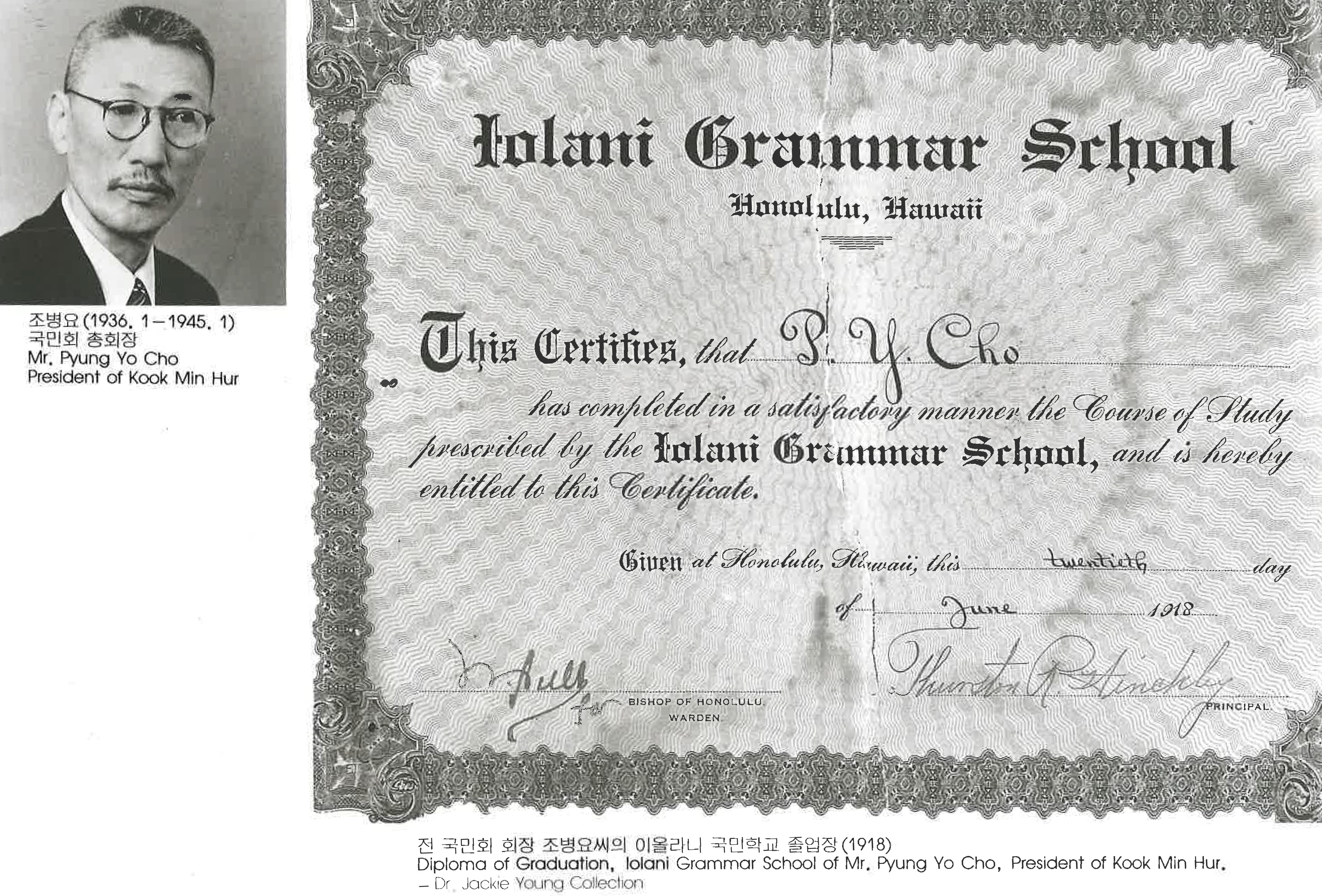 4s5Gzegz... | 전 국민회 회장 조병요씨의 이올라니 국민학교 졸업장(1918) Diploma of Graduation, lolani Grammar School of Mr. FVung Yo Cho, President of Kook Min Hur. | 조병요 | 그들의 발자취 | Dr, Jackie Young Collection | 184 | - | img2 | 25-09-14 | 25-12-06 | ||||||||||||