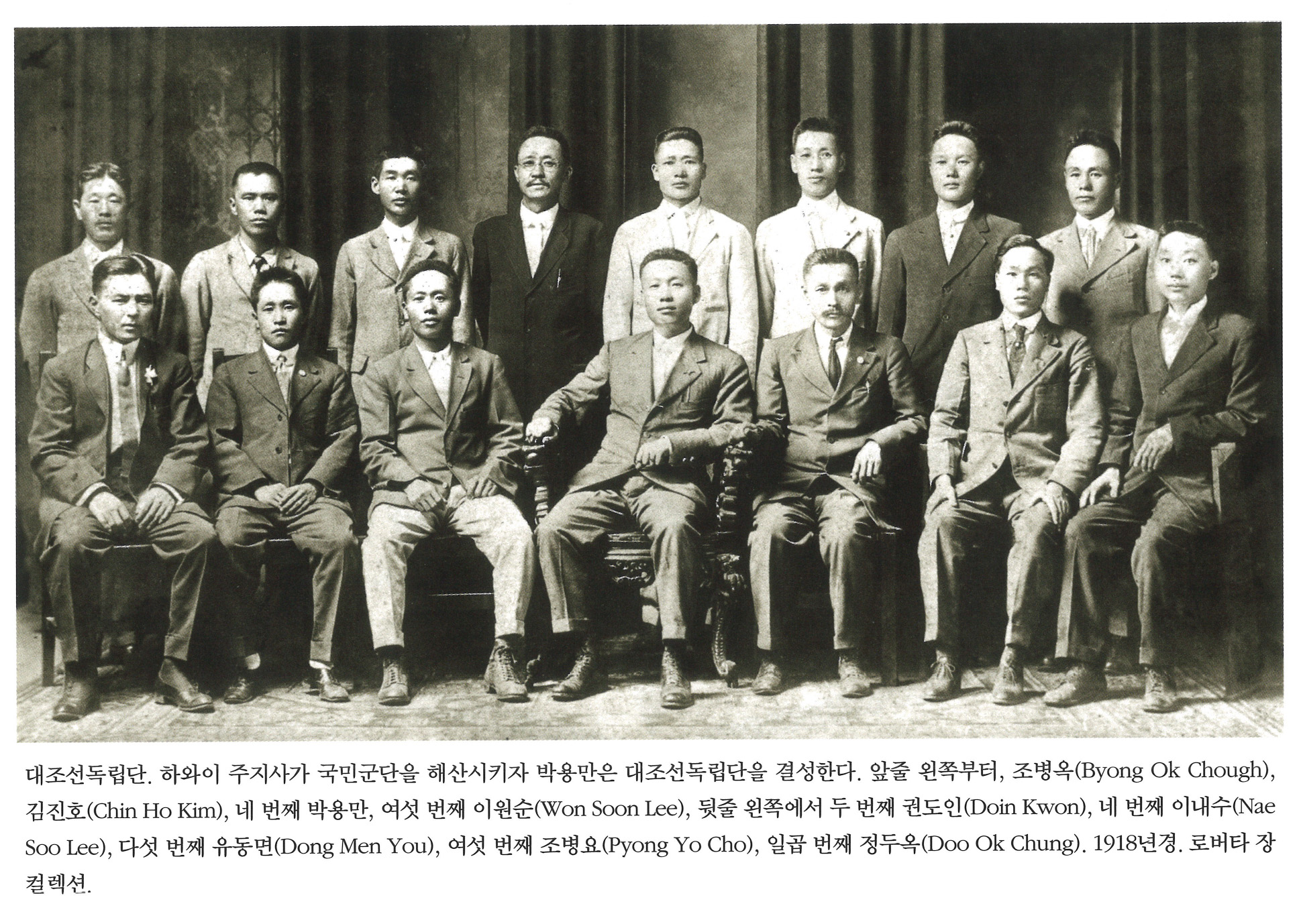 3lkQzcX-... | 대조선독립단. 하와이 주지사가 국민군단을 해산시키자 박용만은 대조선독립단을 결성한다. 앞줄 왼쪽부터, 조병옥(Byong Ok Chough), 김진호(Chin Ho Kim), 네 번째 박용만, 여섯 번째 이원순(Won Soon Lee), 뒷줄 왼쪽에서 두 번째 권도인(Doin Kown), 네 번째 이내수(Nae Soo Lee), 다섯 번째 유동면(Dong Men You), 여섯 번째 조병요(Pyong Yo Cho), 일곱 번째 정두옥(Doo Ok Chung). 1918년경. 로버타 장 컬렉션. | 박용만, 조병옥 (Byong Ok Chough), 김진호 (Chin Ho Kim), 이원순 (Won Soon Lee), 권도인 (Doin Kown), 이내수 (Nae Soo Lee), 유동면 (Dong Men You), 조병요 (Pyong Yo Cho), 정두옥 (Doo Ok Chung) | - | img2 | 25-09-14 | 26-01-01 | |||||||||||||||