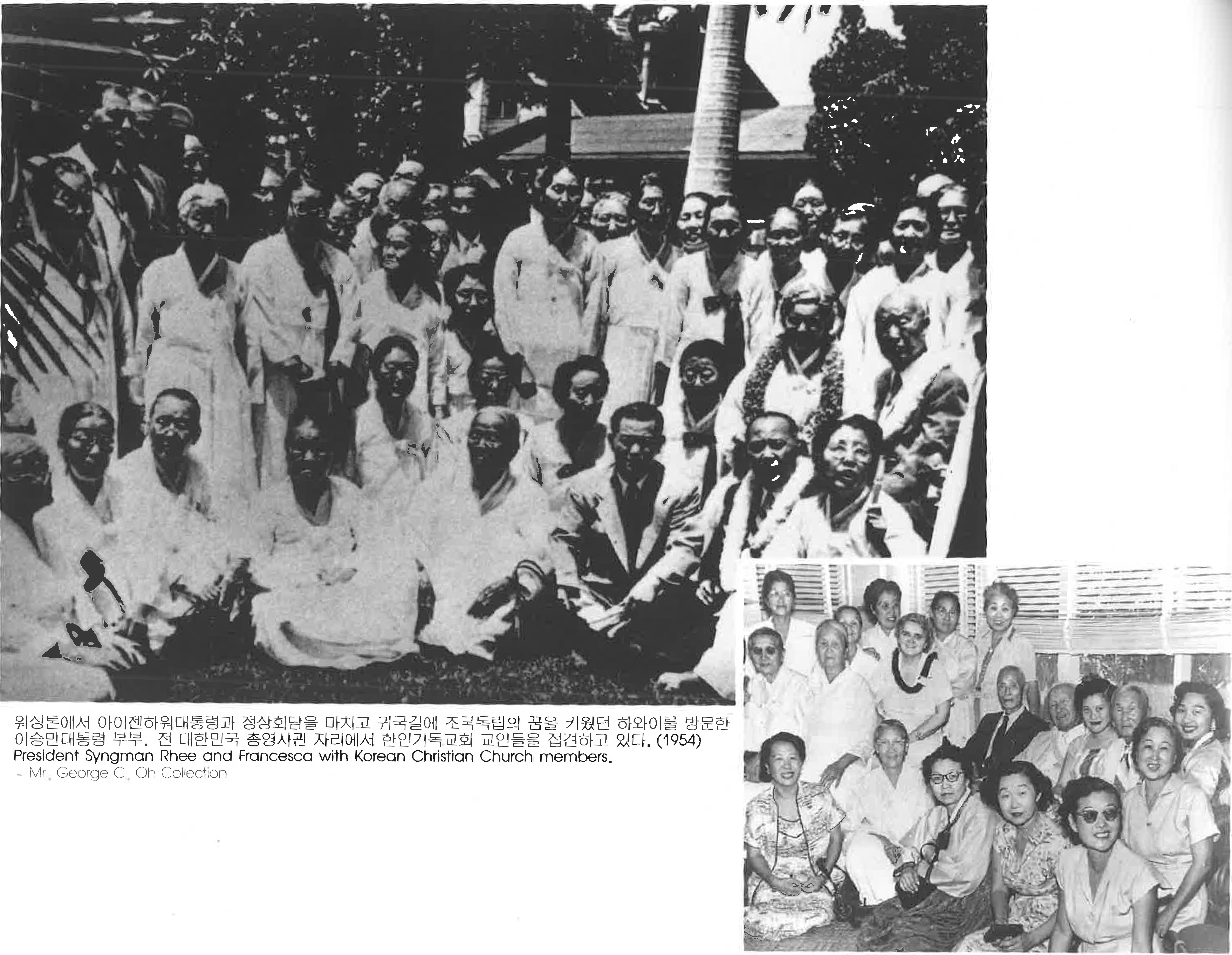4yXcQz9M... | 워싱톤에서 아이젠하워대통령과 정상회담을 마치고 귀국길에 조국독립의 끔을 키웠던 하와이를 방문한 이승만대통령 부부. 전 대한민국 총영사관 자리에서 한인기독교회 교인들을 접견하고 있다. (1954) President Syngman Rhee and Francesca with Korean Christian Church members. | 이승만, 프란체스카 | 그들의 발자취 | Mr. George C, Oh Collection | 200 | img1 | img2 | 25-09-14 | 25-12-06 | ||||||||||||