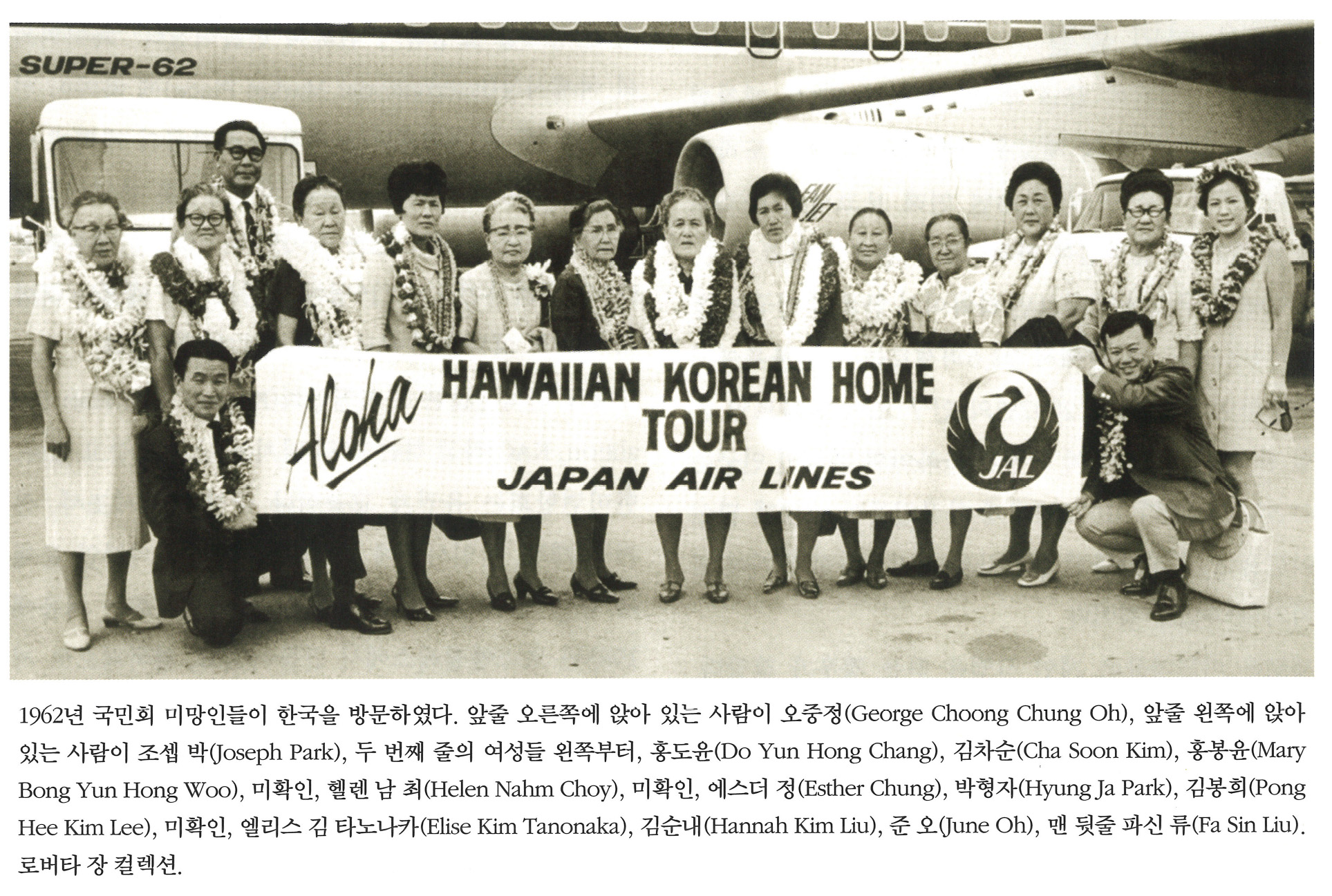 3N3gZd6j... | 1962년 국민회 미망인들이 한국을 방문하였다. 앞줄 오른쪽에 앉아 있는 사람이 오중정(George Choong Chung Oh), 앞줄 왼쪽에 앉아있는 사람이 조셉 박(Joseph Park), 두 번째 줄의 여성들 왼쪽부터, 홍도윤(Do Yun Hong Chang), 김차순(Cha Soon Kim), 홍봉윤(Mary Bong Yun Hong Woo), 미확인, 헬렌 남 최(Helen Nahm Choy), 미확인, 에스더 정(Esther Chung), 박형자(Hyung Ja Park), 김봉희(Pong Hee Kim Lee), 미확인, 엘리스 김 타노나카(Elise Kim Tanonaka), 김순내(Hannah Kim Liu), 준 오(June Oh), 맨 뒷줄 파신 류(Fa Sin Liu). 로버타 장 컬렉션. | 오중정, 조셉 박, 홍도윤, 김차순, 홍봉윤, 헬렌 남 최, 에스더 정, 박형자, 김봉희, 엘리스 김 타노나카, 김순내, 준 오, 파신 류, 로버타 장. | - | img2 | 25-09-14 | 25-12-06 | |||||||||||||||