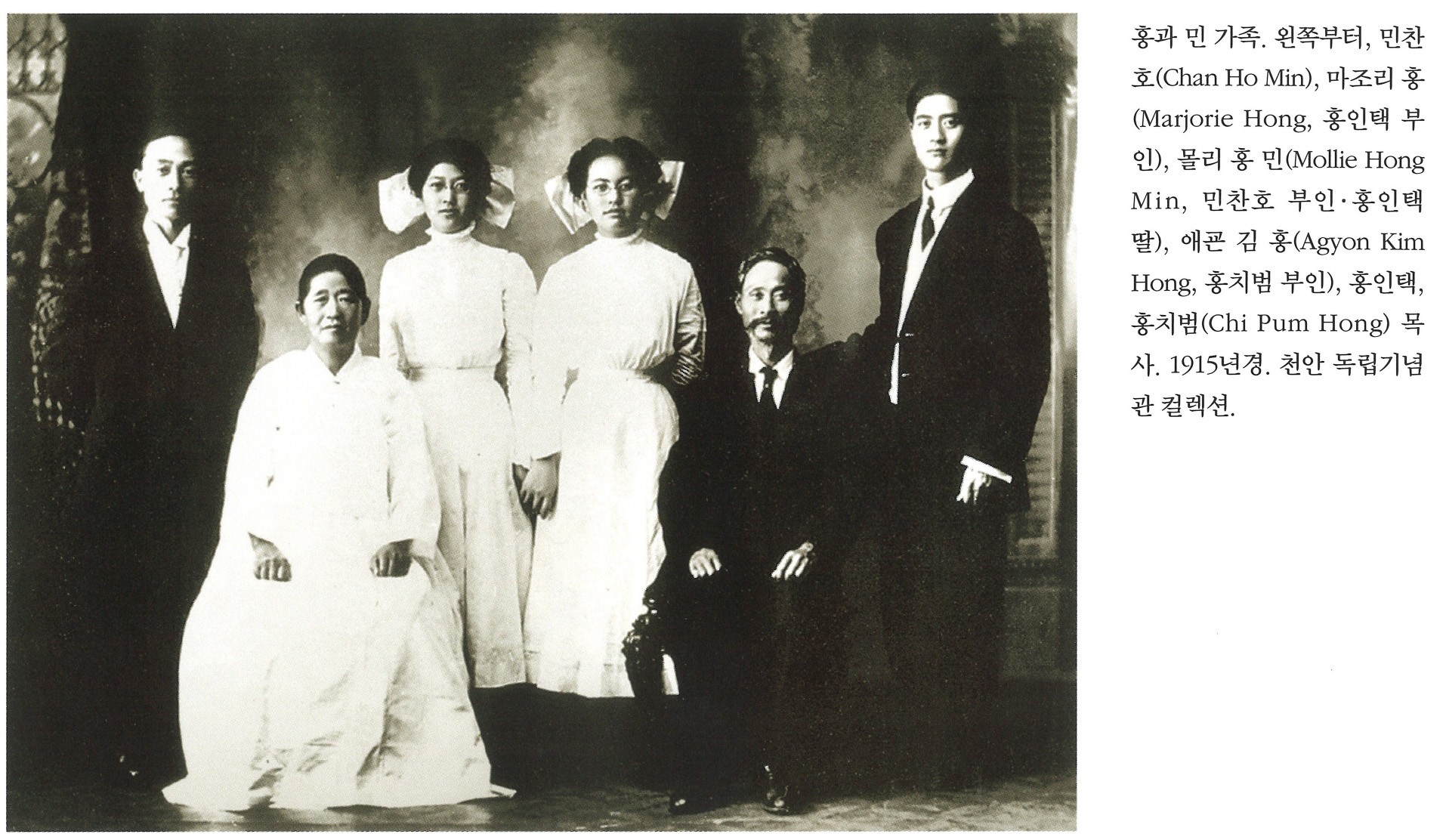홍과 민 가족. 왼쪽부터, 민찬호(Chan Ho Min), 마조리 홍(Marjorie Hong, 홍인택 부인), 몰리 홍 민 (Mollie Hong Min, 민찬호 부인 · 홍인택 딸), 애굔 김 홍(Agyon Kim Hong, 홍치범 부인), 홍인택, 홍치범(Chi Pum Hong) 목사. 1915년경. 천안 독립기념관 컬렉션. |