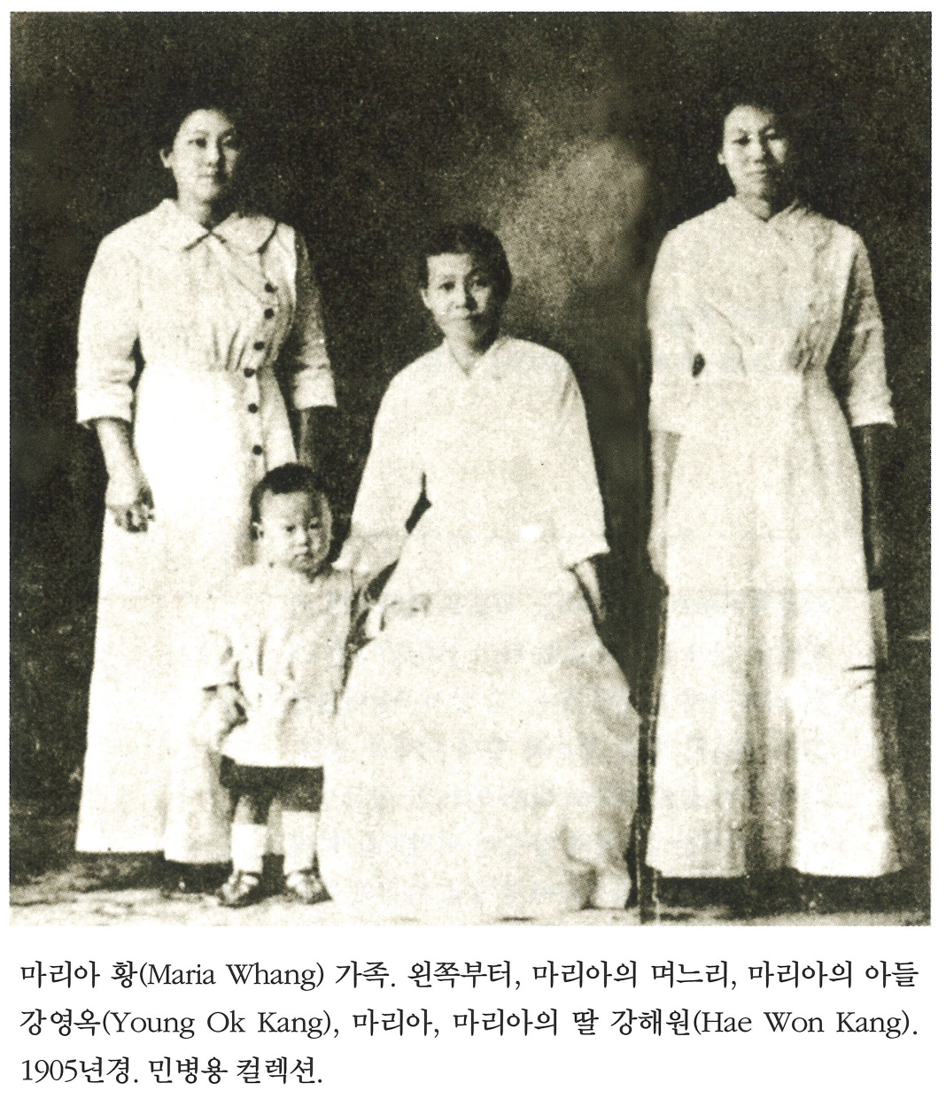 마리아 황(Maria Whang) 가족. 왼쪽부터, 마리아의 며느리, 마리아의 아들 강영옥(Young Ok Kang), 마리아, 마리아의 딸 강해원(Hae Won Kang). 1905년경. 민병용 컬렉션. |