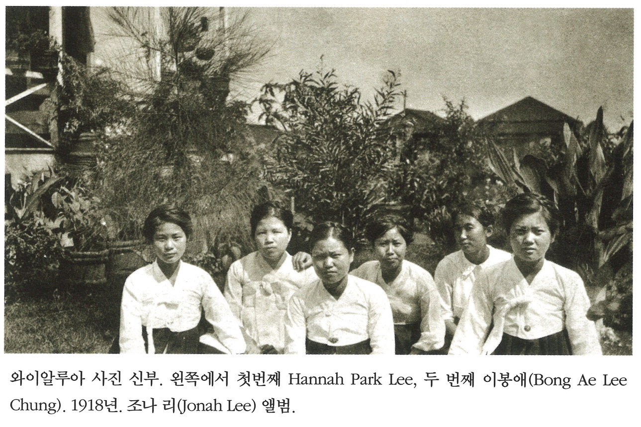 와이알루아 사진 신부. 왼쪽에서 첫번째 Hannah Park Lee, 두 번째 이봉애(Bong Ae Lee). 1918년. 조나 리(Jonah Lee) 앨범. |