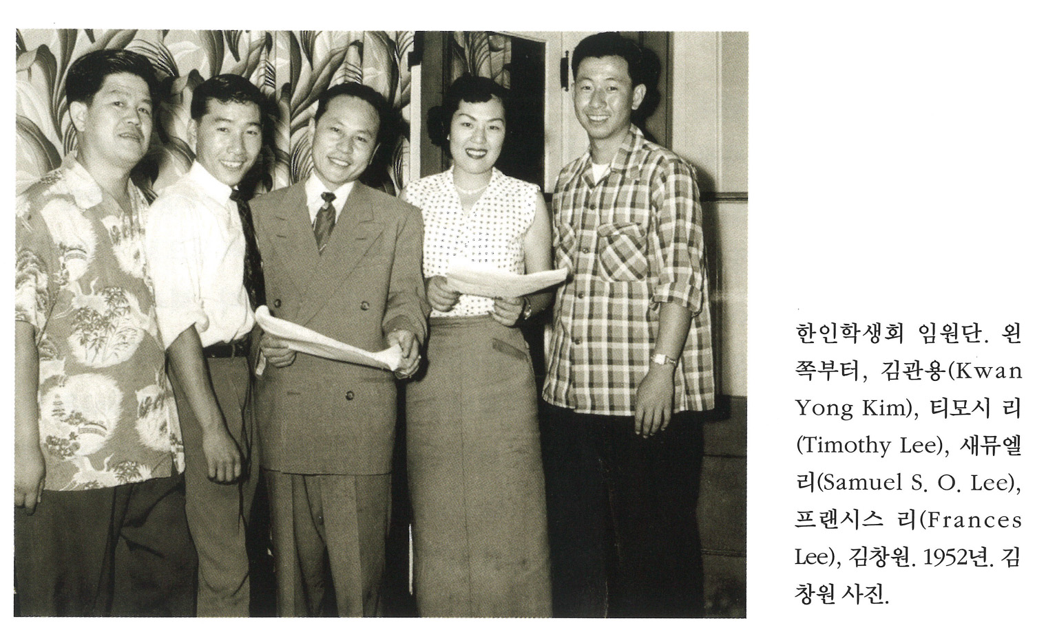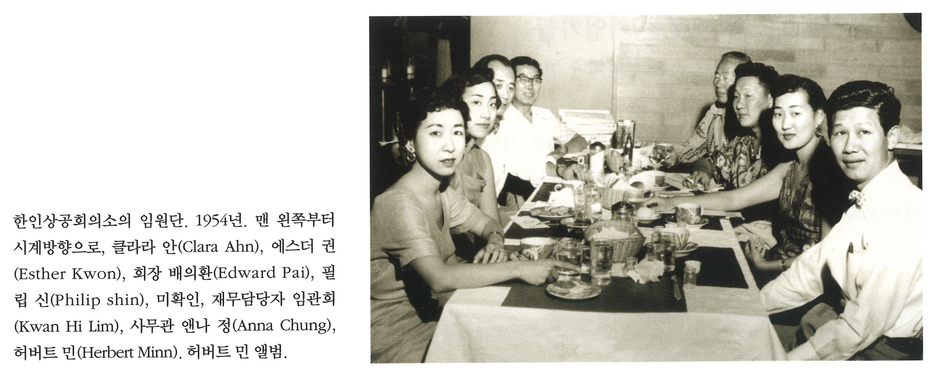 WKvPDnGa... | 한인상공회의소의 임원단. 1954년. 맨 왼쪽부터 시계방향으로, 클라라 안(Clara Ahn), 에스더 권(Esther Kwon), 회장 배의환(Edward Pai), 필립 신(Philip Shin), 미확인, 재무담당자 임관희(Kwan Hi Lim), 사무관 앤나 정(Anna Chung), 허버트 민(Herbert Minn). 허버트 민 앨범 | 클라라 안, 에스더 권, 배의환, 필립 신, 임관희, 앤나 정, 허버트 민. | - | img2 | 25-09-14 | 25-12-06 | |||||||||||||||