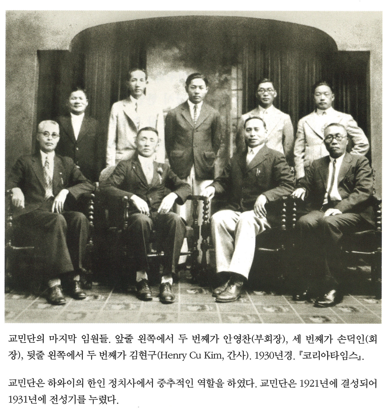 xqV.XHWL... | 교민단의 마지막 임원들. 앞줄 왼쪽에서 두 번째가 안영찬(부회장), 세 번째가 손덕인(회장), 뒷줄 왼쪽에서 두 번째가 김현구(, 간사). 1930년경. 『코리아타임스 』. 교민단은 하와이의 한인 정치사에서 중추적인 역할을 하였다. 교민단은 1921년에 결성되어 1931년에 전성기를 누렸다. | 안영찬, 손덕인, 김현구 | - | img2 | 25-09-14 | 25-12-06 | |||||||||||||||