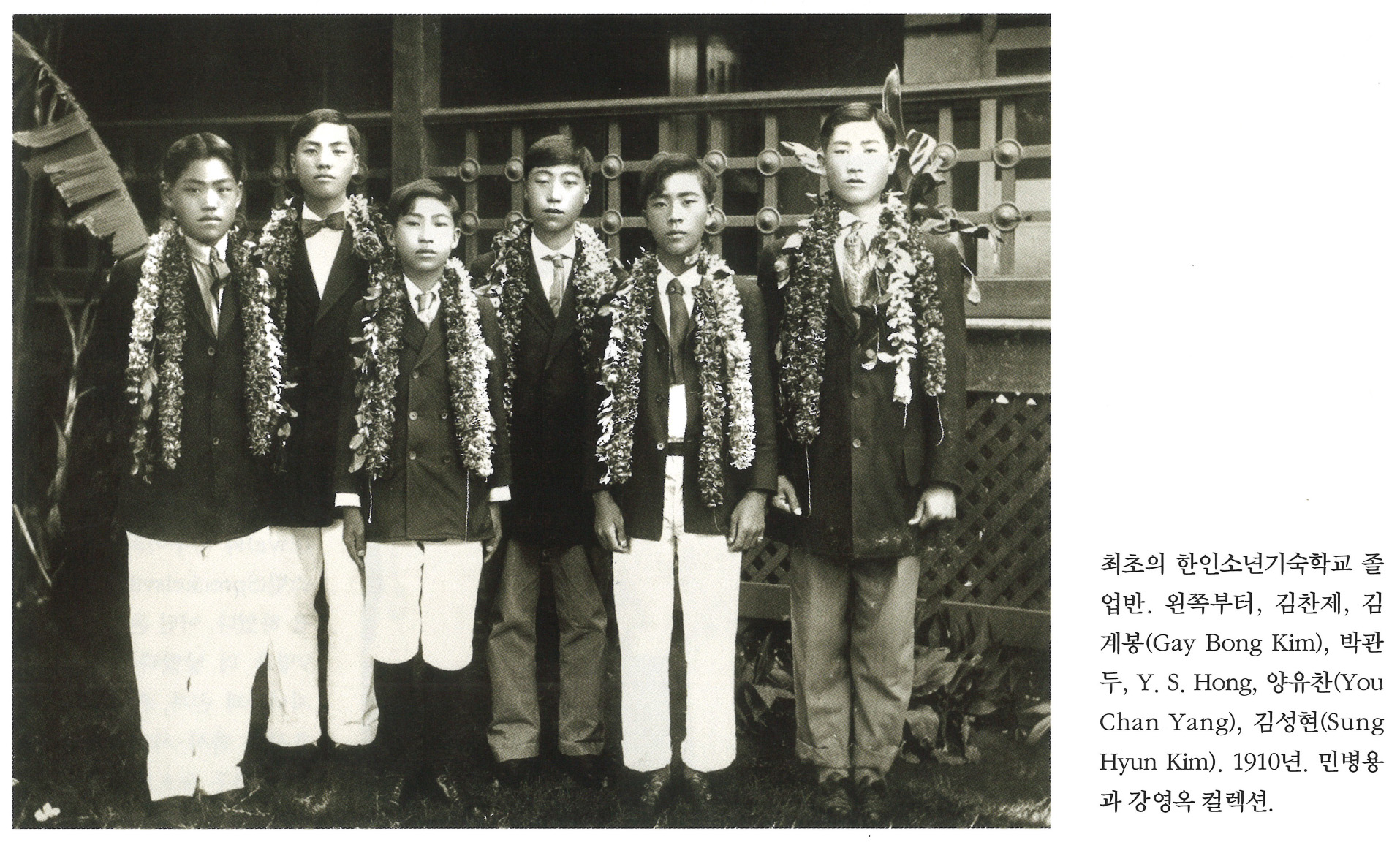 xdcX2QQx... | 최초의 한인소년기숙학교 졸업반. 왼쪽부터, 김찬제, 김계봉(Gay Bong Kim), 박관두, Y. S. Hong, 양유찬(You Chan Yang), 김성현(Sung Hyun Kim). 1910년. 민병용과 강영옥 컬렉션. | 김찬제, 김계봉, 박관두, Y. S. Hong, 양유찬, 김성현 | - | img2 | 25-09-14 | 25-12-06 | |||||||||||||||
