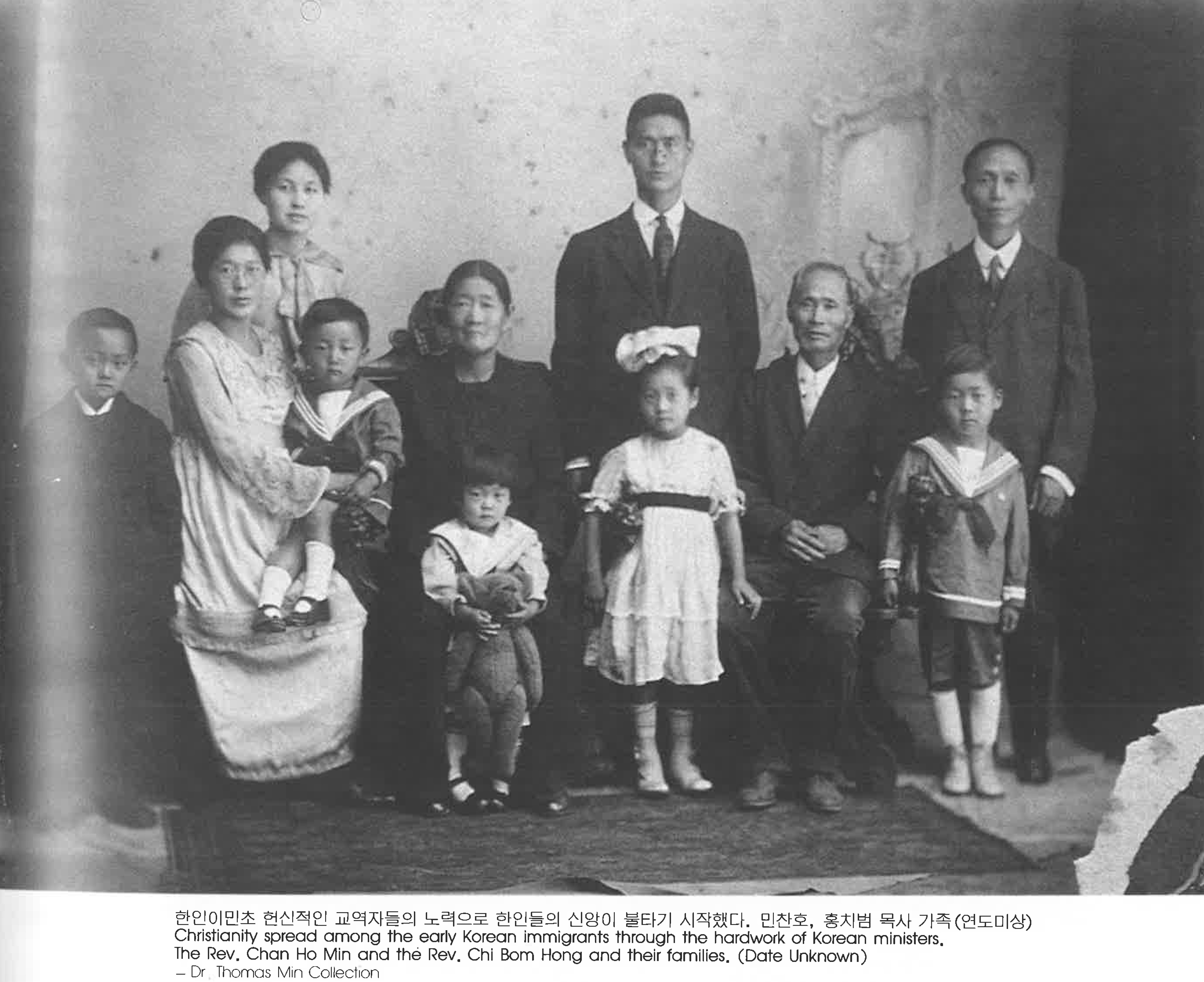 I8B4x6H1... | 한인이민초 헌신적인 교역자들의 노력으로 한인들의 신앙이 불타기 시작했다. 민찬호, 홍치범 목사 가족(연도미상) Christianity spread among the early Korean immigrants through the hard work of Korean ministers. The Rev. Chan Ho Min and the Rev. Chi Bom Hong and their families. (Date Unknown) | 민찬호, 홍치범 | 그들의 발자취 | Dr Thomas Min Collection | 43 | img1 | img2 | 25-09-14 | 25-12-06 |
