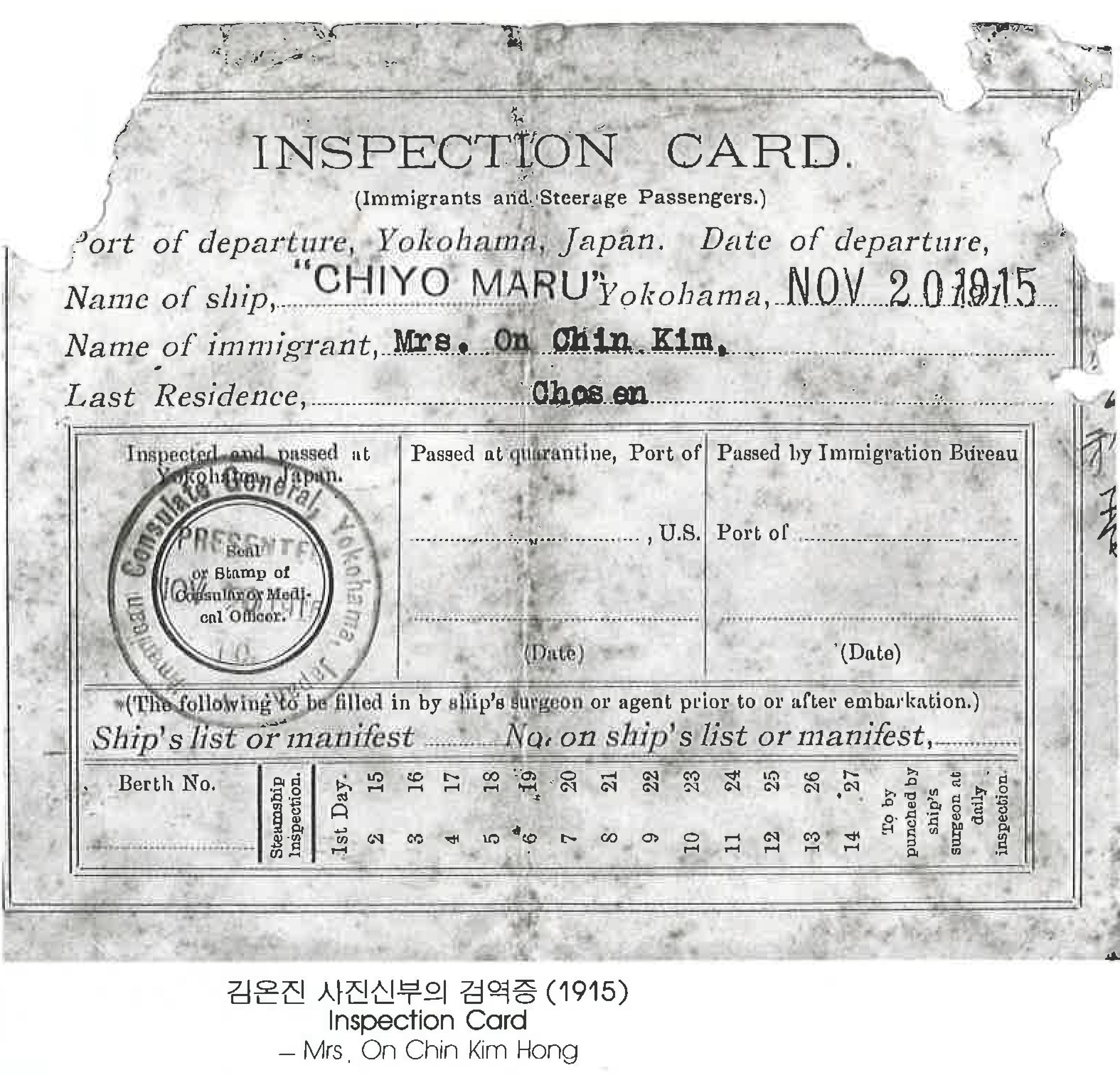 InpvXG8o... | 김온진 사진신부의 검역증 (1915) Inspection Card 一 Mrs. On Chin Kim Hong | 김온진 | 그들의 발자취 | 59 | img1 | img2 | 25-09-14 | 25-12-06 | |||||||||||||