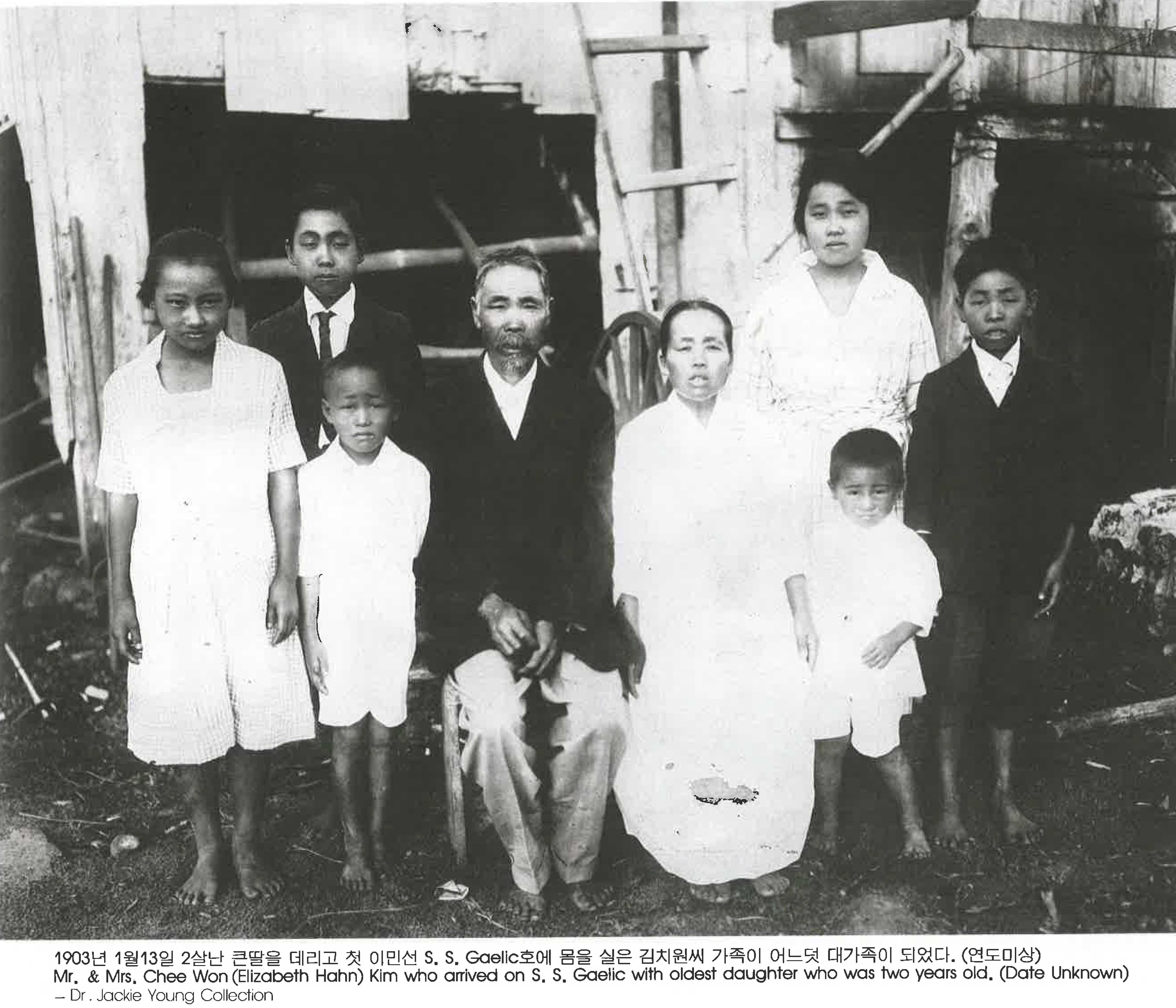 kOkDVi1s... | 1903년 1월 13일 2살난 큰딸을 데리고 첫 이민선 S. S. Gaelic호에 몸을 실은 김치원씨 가족이 어느덧 대가족이 되었다. (연도미상) & Mrs. Chee Won (Elizabeth Hahn) Kim who arrived on S. S. Gaelic with oldest daughter who was two years old. (Date Unknown) | 김치원, 엘리자베스 한 | 그들의 발자취 | Dr. Jackie Young Collection | 김치원 | 15 | img1 | img2 | 25-09-14 | 25-12-06 | |||||||||||