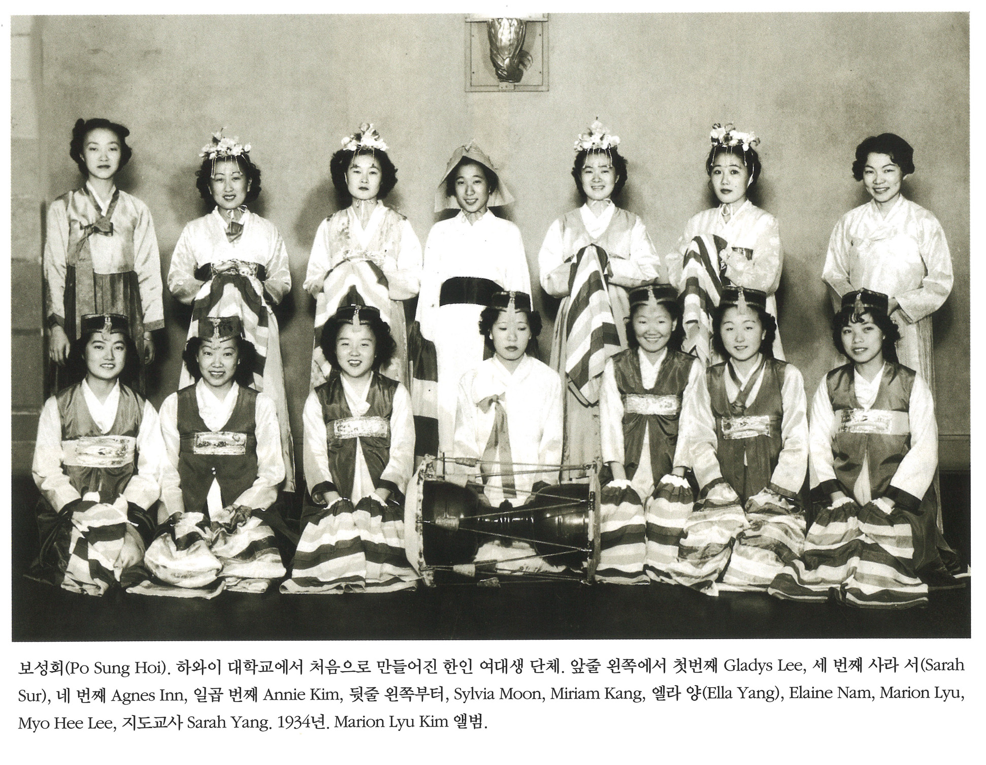uk4WA10V... | 보성회(Po Sung Hoi). 하와이 대학교에서 처음으로 만들어진 한인 여대생 단체. 앞줄 왼쪽에서 첫번째 Gladys Lee, 세 번째 사라 서(Sarah Sur), 네 번째 Agnes Inn, 일곱 번째 Annie Kim, 뒷줄 왼쪽부터, Sylvia Moon, Miriam Kang, 엘라 양( Ella Yang), Elaine Nam, Marion Lyu, Myo Hee Lee, 지도교사 Sarah Yang. 1934년. Marion Lyu Kim 앨범. | Gladys Lee, 사라 서(Sarah Sur), Agnes Inn, Annie Kim, Sylvia Moon, Miriam Kang, 엘라 양(Ella Yang), Elaine Nam, Marion Lyu, Myo Hee Lee, Sarah Yang. | - | img2 | 25-09-14 | 25-12-06 | |||||||||||||||