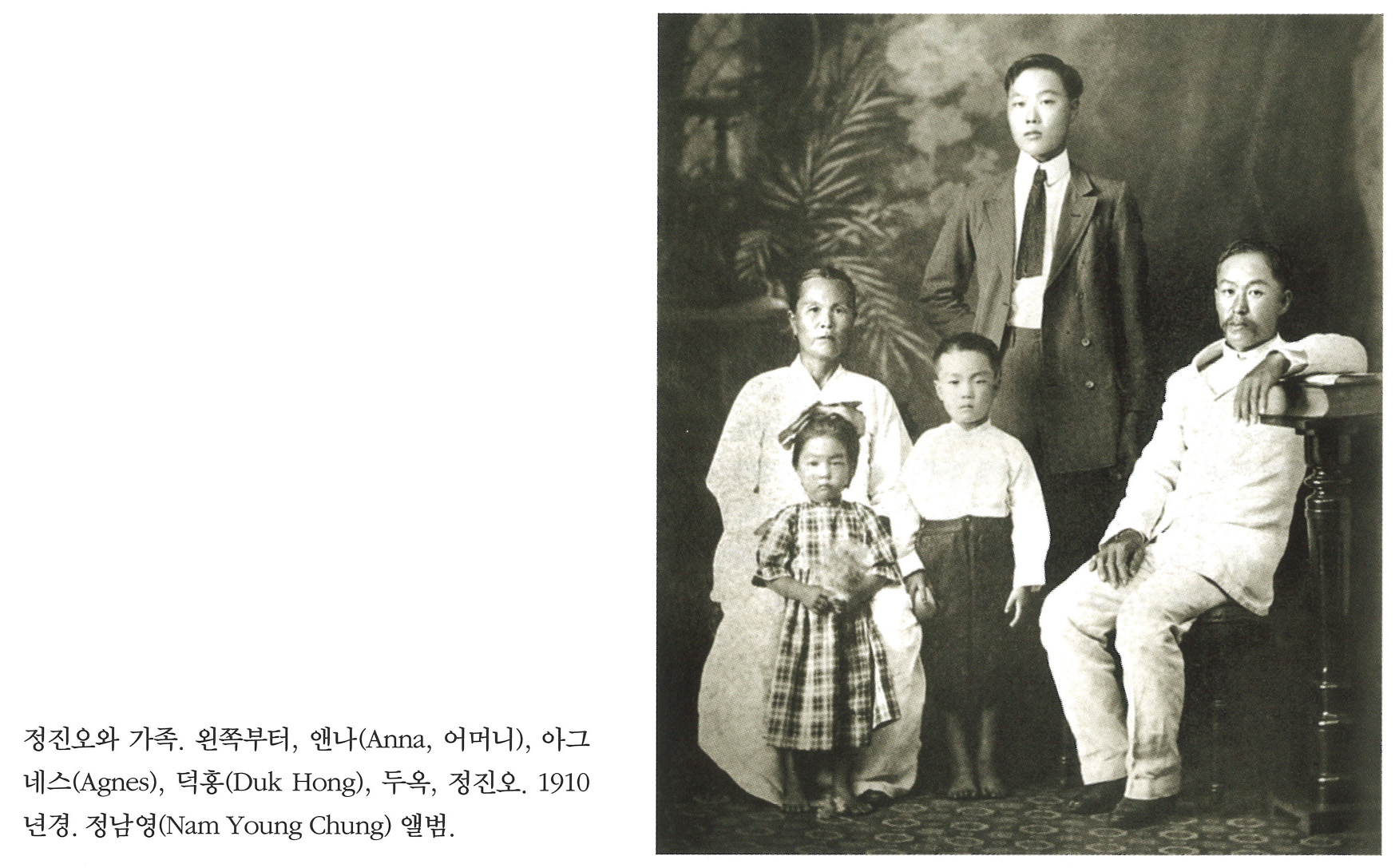 UjkQwpZc... | 정진오와 가족.왼쪽부터, 앤나(Anna, 어머니), 아그네스(Agnes), 덕홍(Duk Hong), 두옥, 정진오. 1910년경. 정남영(Nam Young Chung) 앨범. | 정진오, 앤나, 아그네스, 덕홍, 두옥, 정남용 | - | img2 | 25-09-14 | 25-12-31 | |||||||||||||||