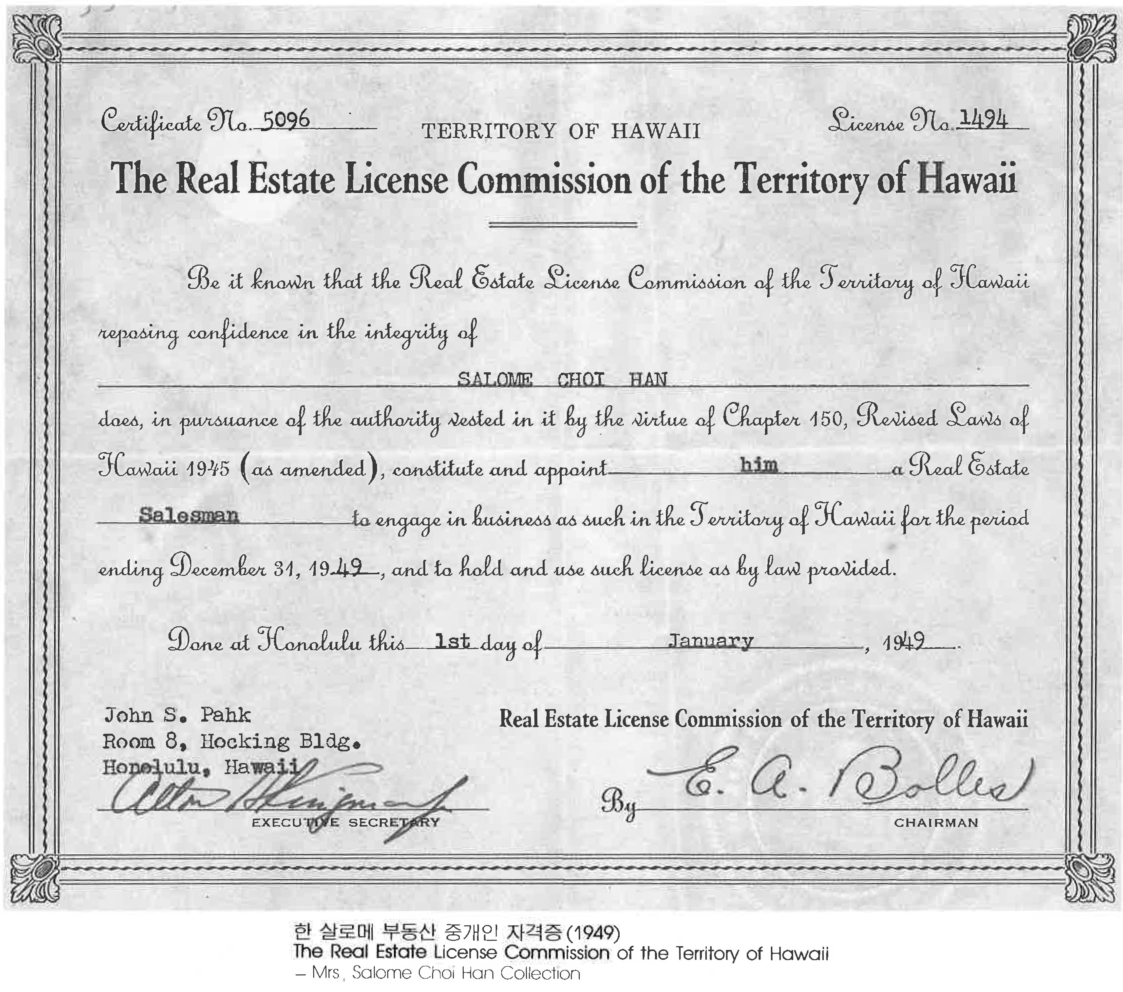 uFmPAa2D... | 한 살로에 부동산 중개인 자격증(1949) The Real Estate License Commission of the Territory of Hawaii | 한 살로 | 그들의 발자취 | Mrs. Salome Choi Han Collection | 206 | - | img2 | 25-09-14 | 25-12-06 | ||||||||||||