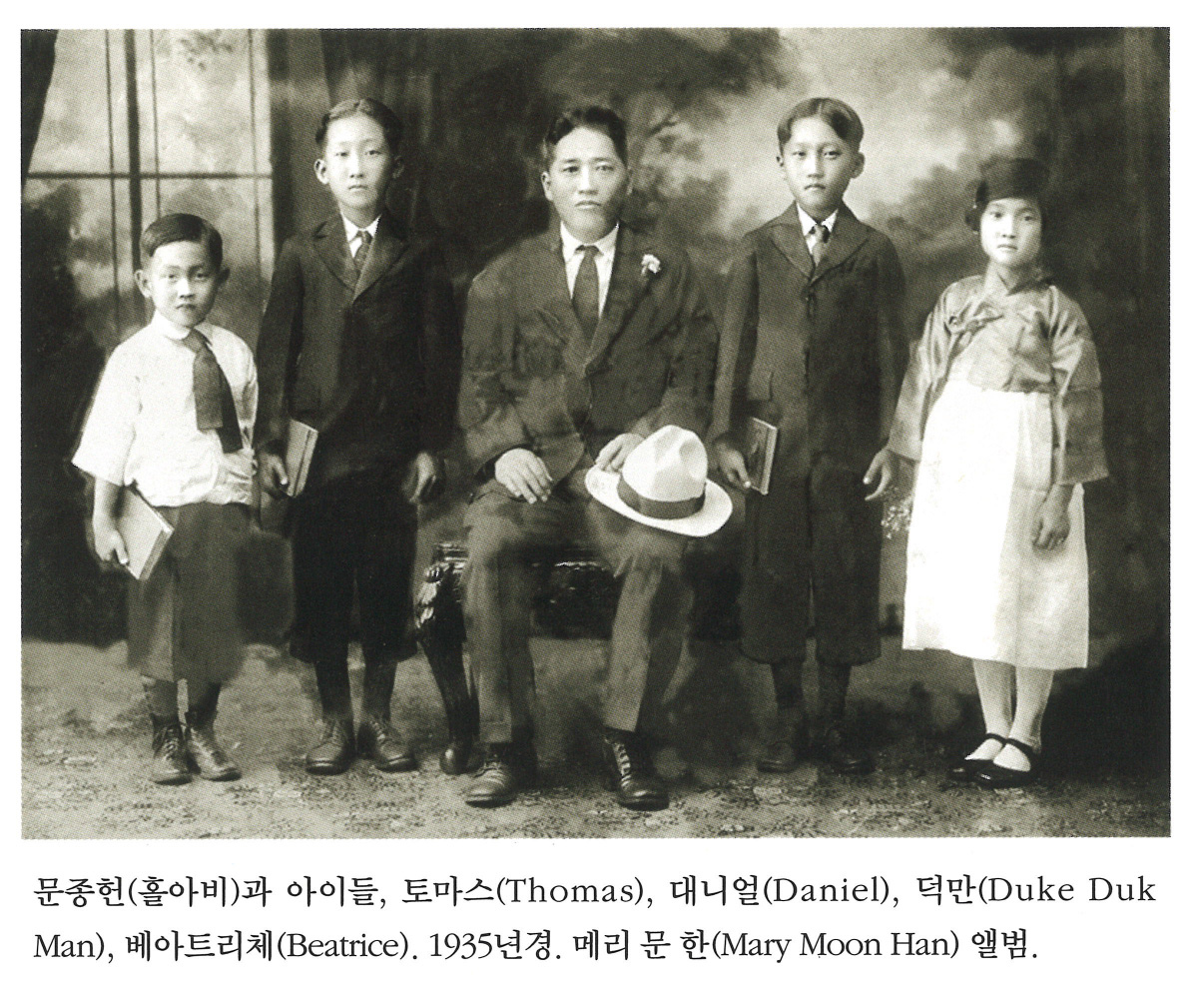 t12lK-Vk... | 문종헌(홀아비)과 아이들, 토마스(Thomas), 대니얼(Daniel), 덕만(Duke Duk Man), 베아트리체(Beatrice). 1935년경. 메리 문 한(Mary Moon Han) 앨범. | 문종헌, 토마스, 대니얼, 덕만, 베아트리체, 메리 문 한. | - | img2 | 25-09-14 | 25-12-06 | |||||||||||||||