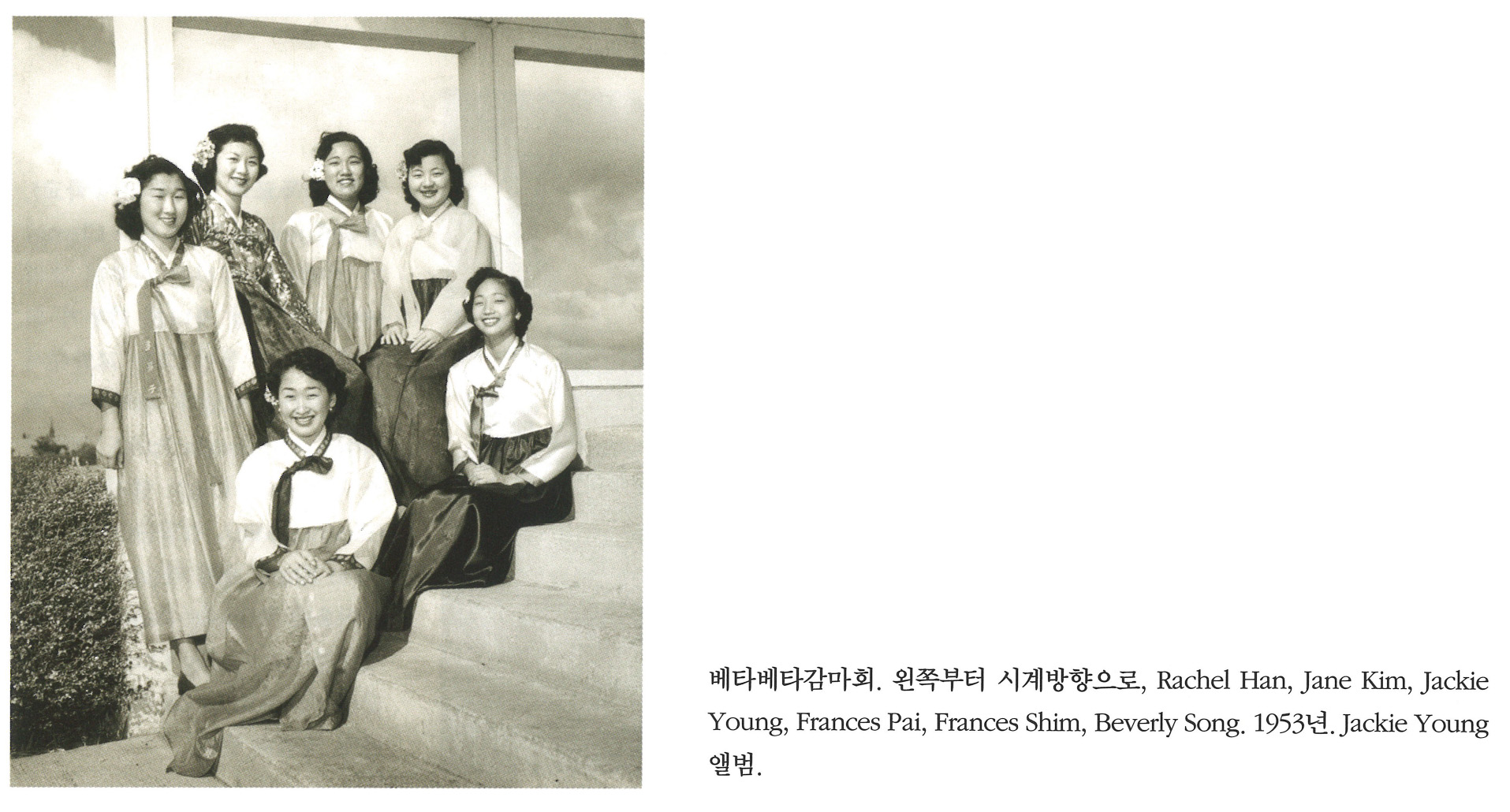 SeAGb4Yk... | 베타베타감마회. 왼쪽부터 시계방향으로, Rachel Han, Jane Kim, Jackie Young, Frances Pai, Frances Shim, Beverly Song. 1953년. Jackie Young 앨범. | Rachel Han, Jane Kim, Jackie Young, Frances Pai, Frances Shim, Beverly Song | - | img2 | 25-09-14 | 25-12-06 | |||||||||||||||