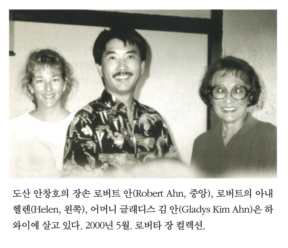 sIqpnBDa... | 도산 안창호의 장손 로버트 안(Robert Ahn, 중앙), 로버트의 아내 헬렌(Helen, 왼쪽), 어머니 글래디스 김 안(Gladys Kim Ahn)은 하와이에 살고 있다. 2000년 5월. 로버타 장 컬렉션. | 로버트 안 (Robert Ahn), 헬렌 (Helen), 글래디스 김 안 (Gladys Kim Ahn) | 오성진 (Chris Sung Jin Oh) | - | img2 | 25-09-14 | 26-01-01 | ||||||||||||||