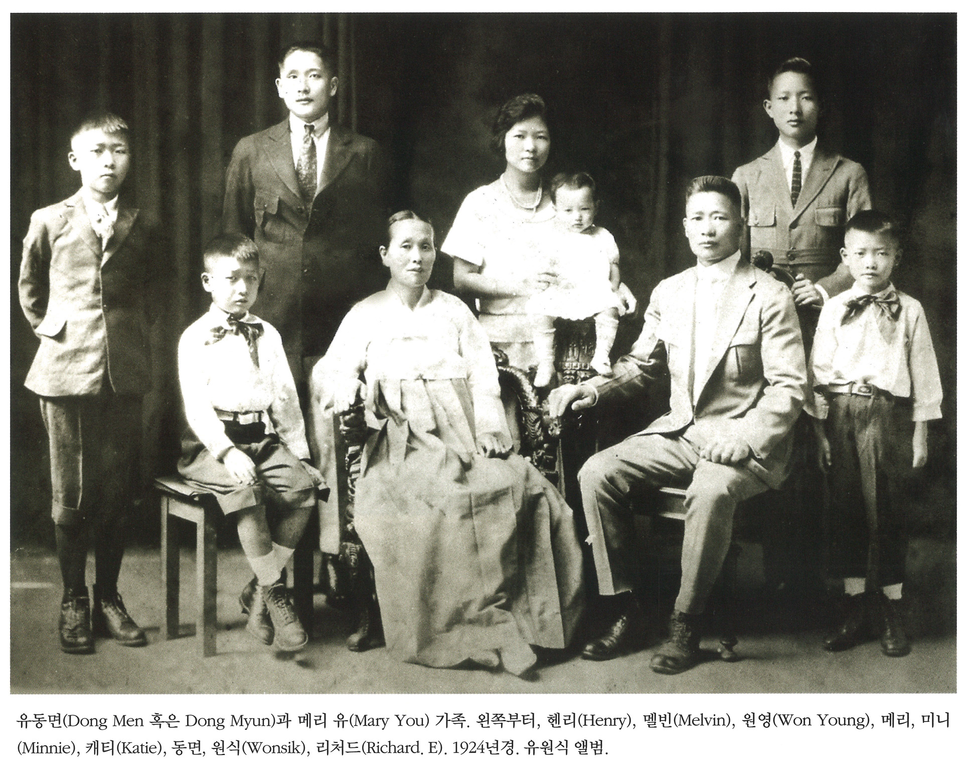 RNR7l4Js... | 유동면 (Dong Men 혹은 Dong Myun)과 메리 유(Mary You) 가족. 왼쪽부터, 헨리(Henry), 멜빈(Melvin), 원영(Won young), 메리, 미니(Minnie), 캐티(Katie), 동면, 원식(Wonsik), 리처드(Richard. E). 1942년경. 유원식 앨범. | 유동면, 메리 유, 헨리, 멜빈, 원영, 미니, 캐티, 원식, 리처드. E | - | img2 | 25-09-14 | 25-12-06 | |||||||||||||||
