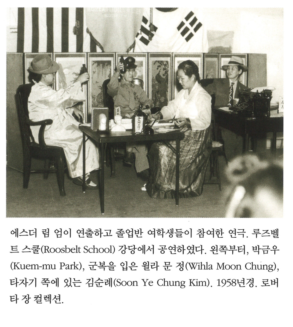 G4icYED0... | 에스더 림 엄이 연출하고 졸업반 여학생들이 참여한 연극. 루즈벨트 스쿨(Roosbelt School) 강당에서 공연하였다. 왼쪽부터, 박금우(Kuem-mu Park), 군복을 입은 윌라 문 정(Wihla Moon Chung), 타자기 쪽에 있는 김순례(Soon Ye Chung Kim). 1958년경. 로버타 장 컬렉션. | 박금우, 윌라 문 정, 김순례 | - | img2 | 25-09-14 | 25-12-06 | |||||||||||||||